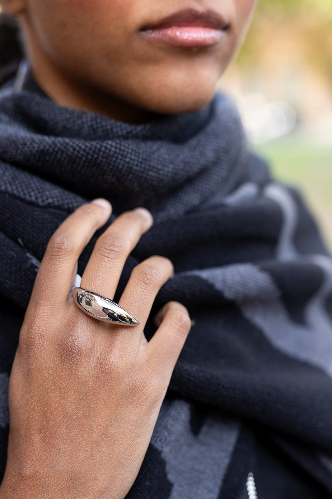 Ez a modern, szoborszerű gyűrű ívelt, fényes felületével azonnal magára vonzza a tekintetet. Organikus formája egyszerre sugároz erőt és kifinomultságot, így bármilyen megjelenéshez karaktert ad. A sima, polírozott anyag prémium hatást kelt, miközben kényelmes viseletet biztosít egész nap. Tökéletes választás azoknak, akik szeretik az egyedi, mégis időtlen kiegészítőket.