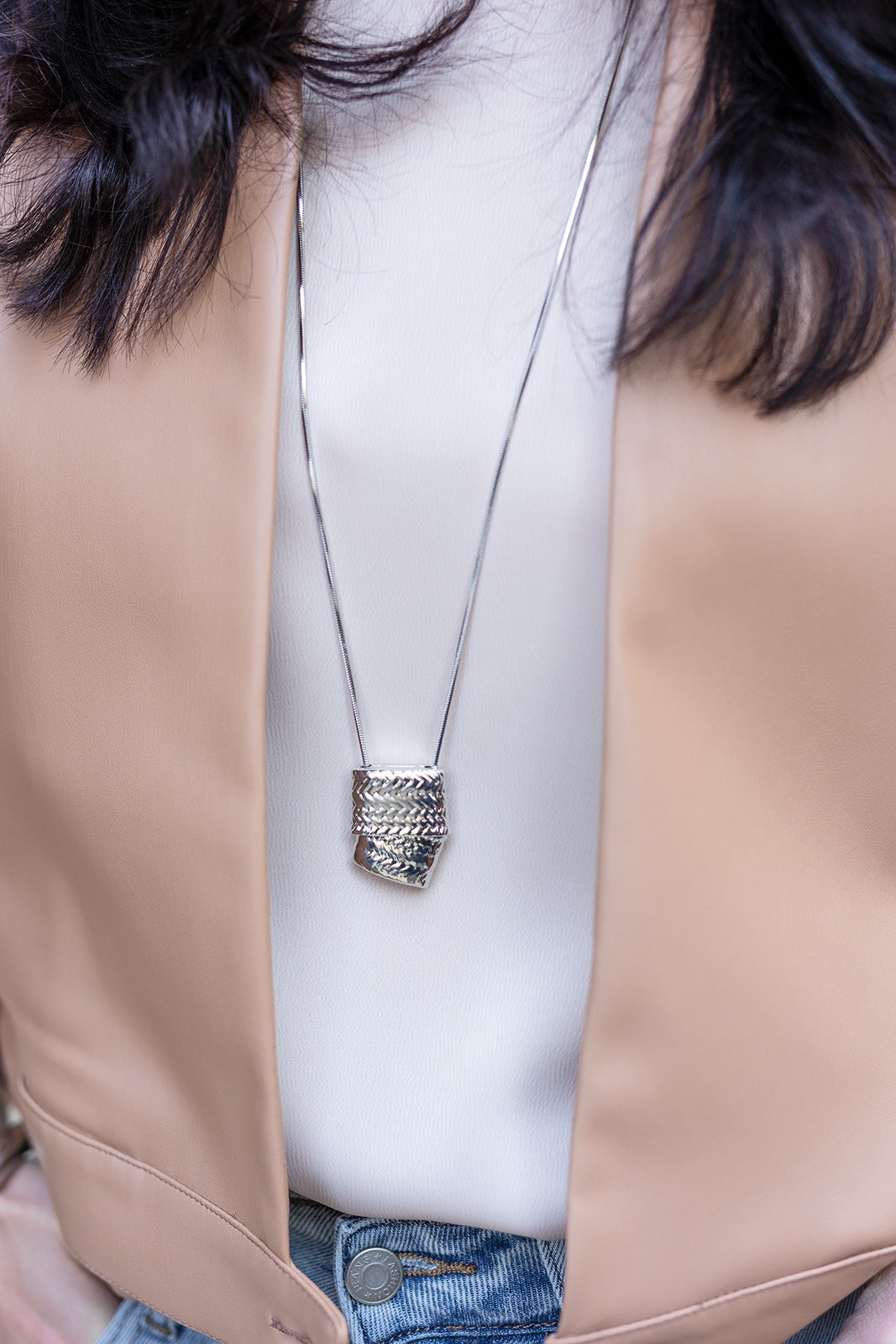 Ez a modern női nyaklánc karakteres medáljával az outfit fókuszpontjává válik. A strukturált, texturált felületű fém medál különleges fényjátékot ad, miközben letisztult eleganciát sugároz. Hosszabb lánckialakítása optikailag nyújtja az alakot, így tökéletes választás blézerhez, felsőhöz vagy ruhához is. Minimalista, mégis statement jellegű ékszer, amely önmagában is erőteljes megjelenést biztosít. Könnyű és kényelmes viselet a mindennapokban, ugyanakkor alkalmi outfitekhez is ideális. Időtálló női ékszer, amely a modern, városi gardrób stílusos kiegészítője lehet.