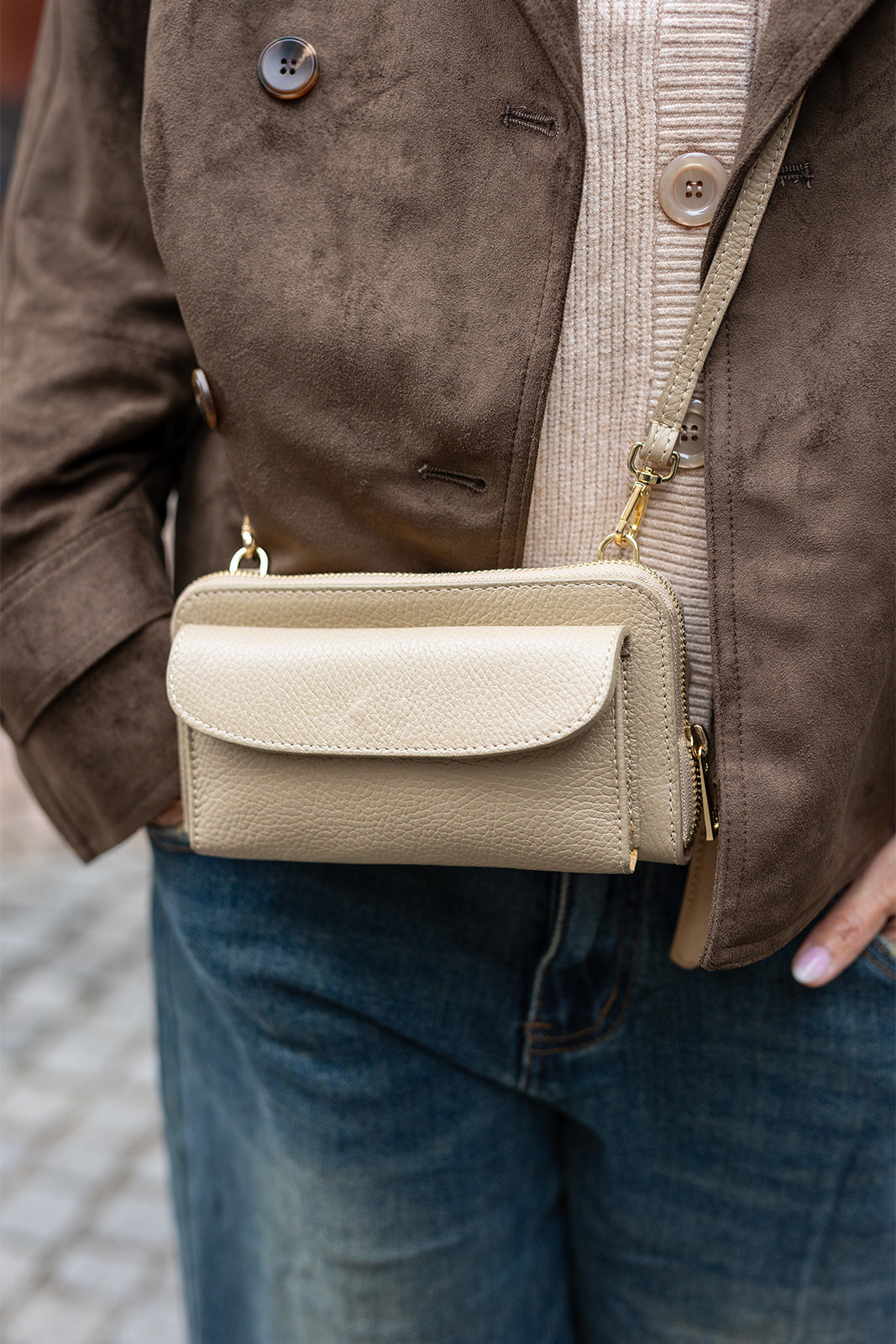 Ez a prémium minőségű, bézs valódi bőr táska időtlen darab, amely eleganciát és praktikusságot visz a mindennapi megjelenésbe. Kompakt, mégis tágas kialakítása lehetővé teszi a legfontosabb dolgok kényelmes tárolását. Finom szemcsézetű bőrfelülete és aranyszínű fém részletei luxus érzetet keltenek. Az állítható pántnak köszönhetően keresztben és vállon is kényelmesen viselhető. Ideális választás azoknak, akik szeretik az igényes, letisztult kiegészítőket, amelyek minden szetthez passzolnak.