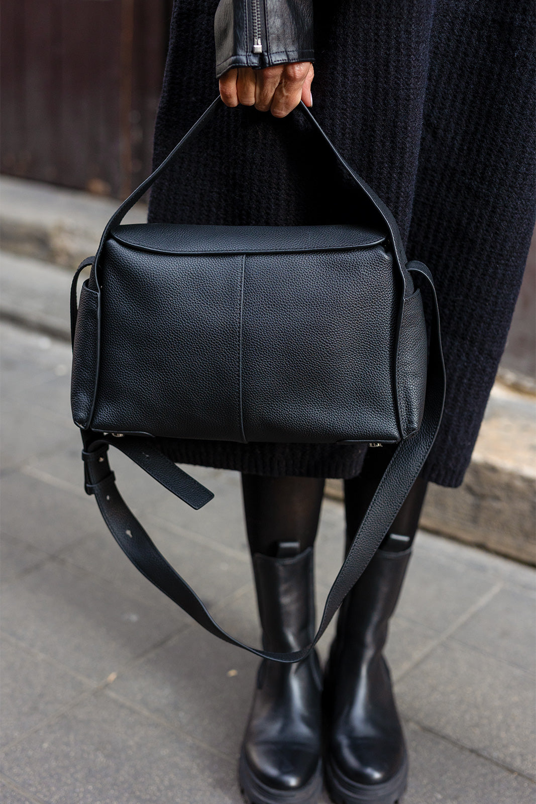 Ez a fekete bőr táska a modern minimalizmus és a funkcionalitás tökéletes találkozása. Prémium minőségű, finom erezetű valódi bőrből készült, ami hosszú élettartamot és elegáns megjelenést biztosít. Tágas belső tere ideális mindennapi használatra, akár munkába, akár városi sétákhoz. A letisztult forma, az állítható pánt és a finoman kidolgozott részletek egyszerre teszik praktikussá és stílusossá. Ez a klasszikus fekete bőr táska minden ruhatár nélkülözhetetlen, időtálló darabja.