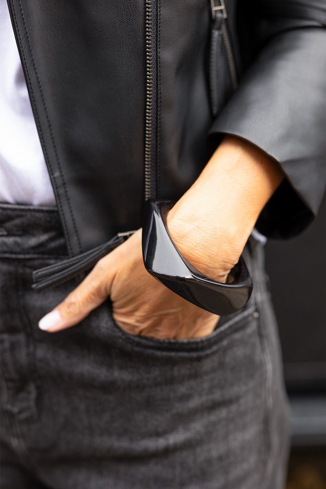 Ez a fekete karkötő modern és minimalista kiegészítő, amely tökéletes választás mindennapi és elegáns szettekhez egyaránt. Fényes felülete és különleges, szögletes formája igazán egyedi megjelenést kölcsönöz. Könnyen kombinálható más ékszerekkel, ugyanakkor önmagában is stílusos hangsúlyt ad az öltözéknek. A fekete karkötő univerzális darab, amely minden alkalomhoz illik – legyen szó munkáról, városi sétáról vagy esti programról.