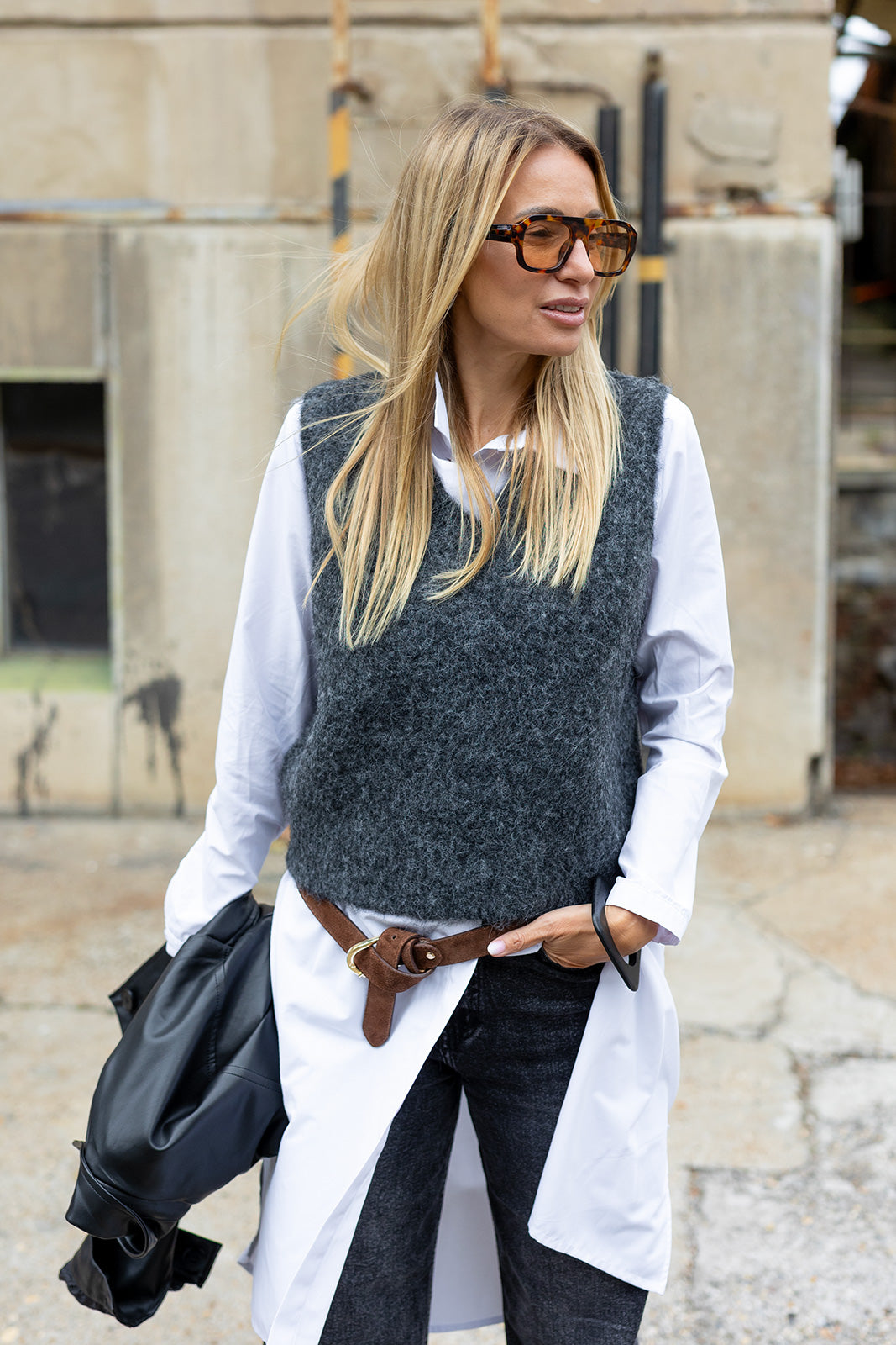 Szürke kötött mellény ideális választás a réteges öltözködéshez a hűvösebb napokon. Puha, meleg tapintású anyaga kényelmes viseletet biztosít egész nap. Rövid, laza fazonja modern megjelenést kölcsönöz, miközben könnyen kombinálható inggel, pólóval vagy akár blúzzal is. Letisztult, egyszínű kialakítása sokoldalúan beilleszthető bármilyen ruhatárba. Tökéletes mindennapi viseletre, de stílusos kiegészítője lehet elegáns szetteknek is.