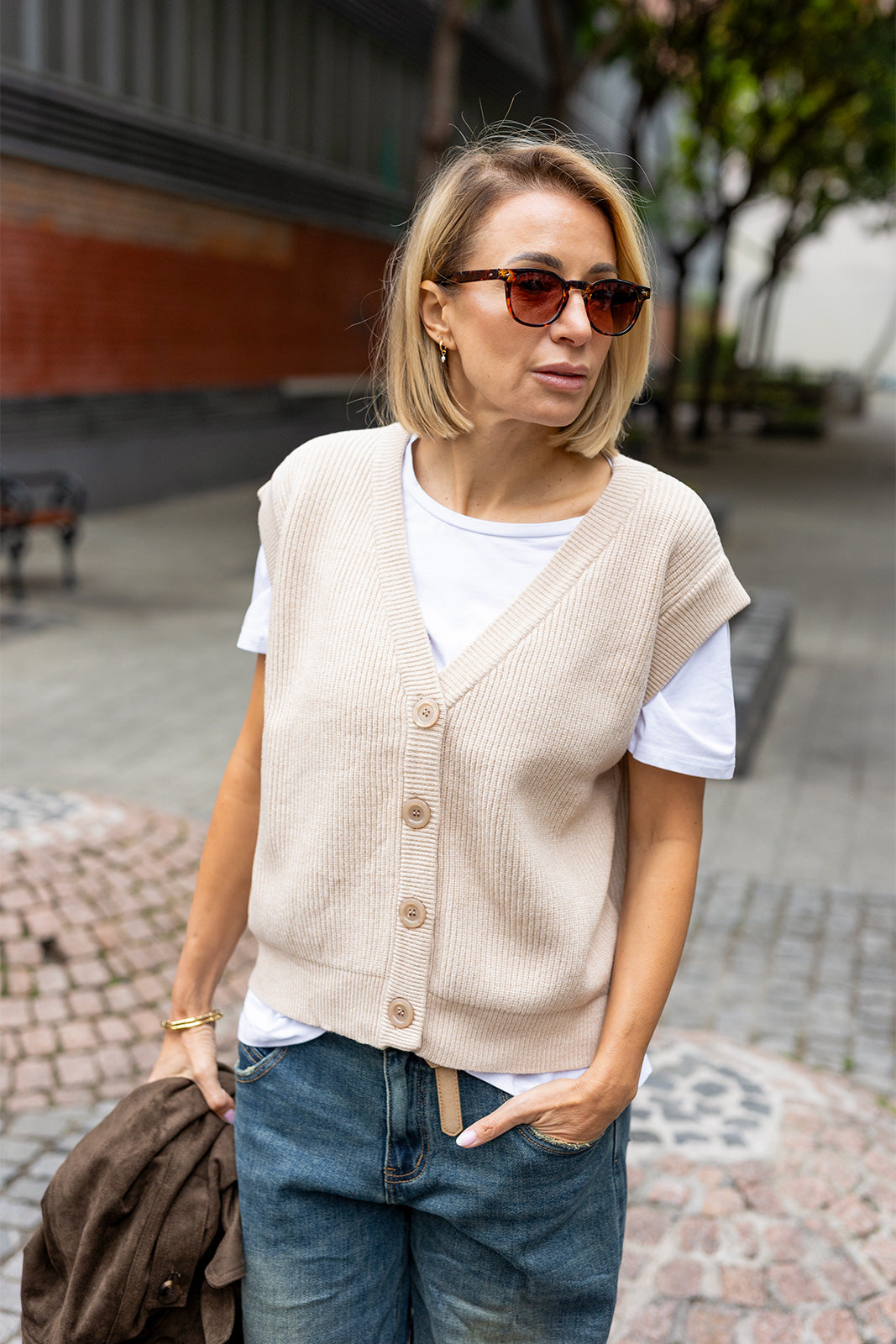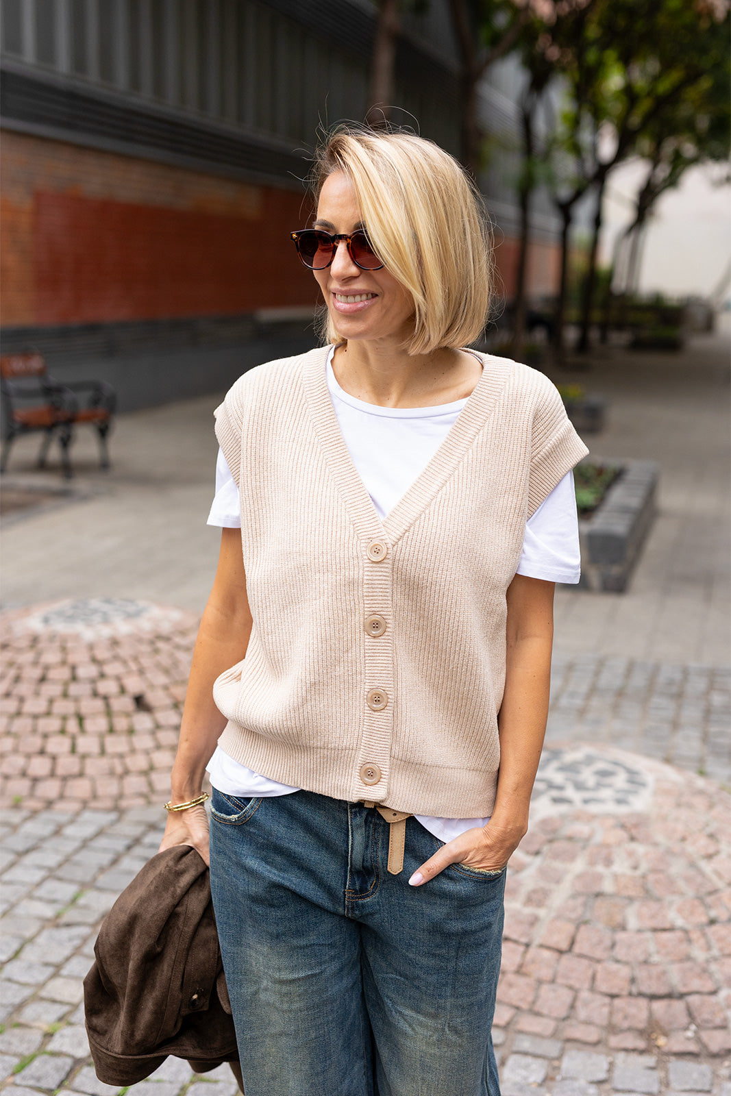 Ez a bézs női kötött mellény tökéletes választás a réteges, stílusos öltözködéshez. Laza szabása és puha, rugalmas anyaga kényelmes viseletet biztosít egész nap, miközben letisztult megjelenést kölcsönöz. A V-kivágás és a gombos részlet klasszikus, időtlen megjelenést ad a darabnak. Könnyedén kombinálható inggel, pólóval vagy akár egy vékony garbóval is a hűvösebb napokra. Ideális választás mindennapi outfitekhez, ha a kényelem és a nőies stílus egyszerre fontos számodra.