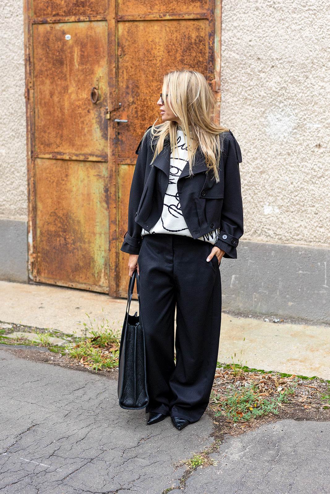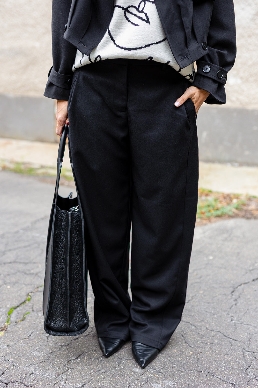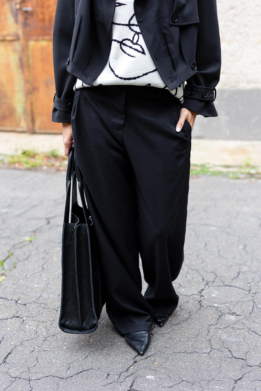 Ez a klasszikus fekete nadrág a letisztult elegancia megtestesítője, amely minden nő ruhatárában alapdarab. Egyenes, enyhén bővebb szárú fazonja modern és kényelmes, így ideális választás mindennapi viselethez vagy irodai megjelenéshez. A minőségi anyag tökéletes tartást biztosít, miközben kellemes viseletet nyújt egész nap. Könnyen kombinálható blézerrel, inggel vagy akár laza pulóverrel is, attól függően, milyen stílust szeretnél elérni. Ez a fekete női nadrág a stílusos, időtálló és praktikus darabok kedvelőinek tökéletes választás.