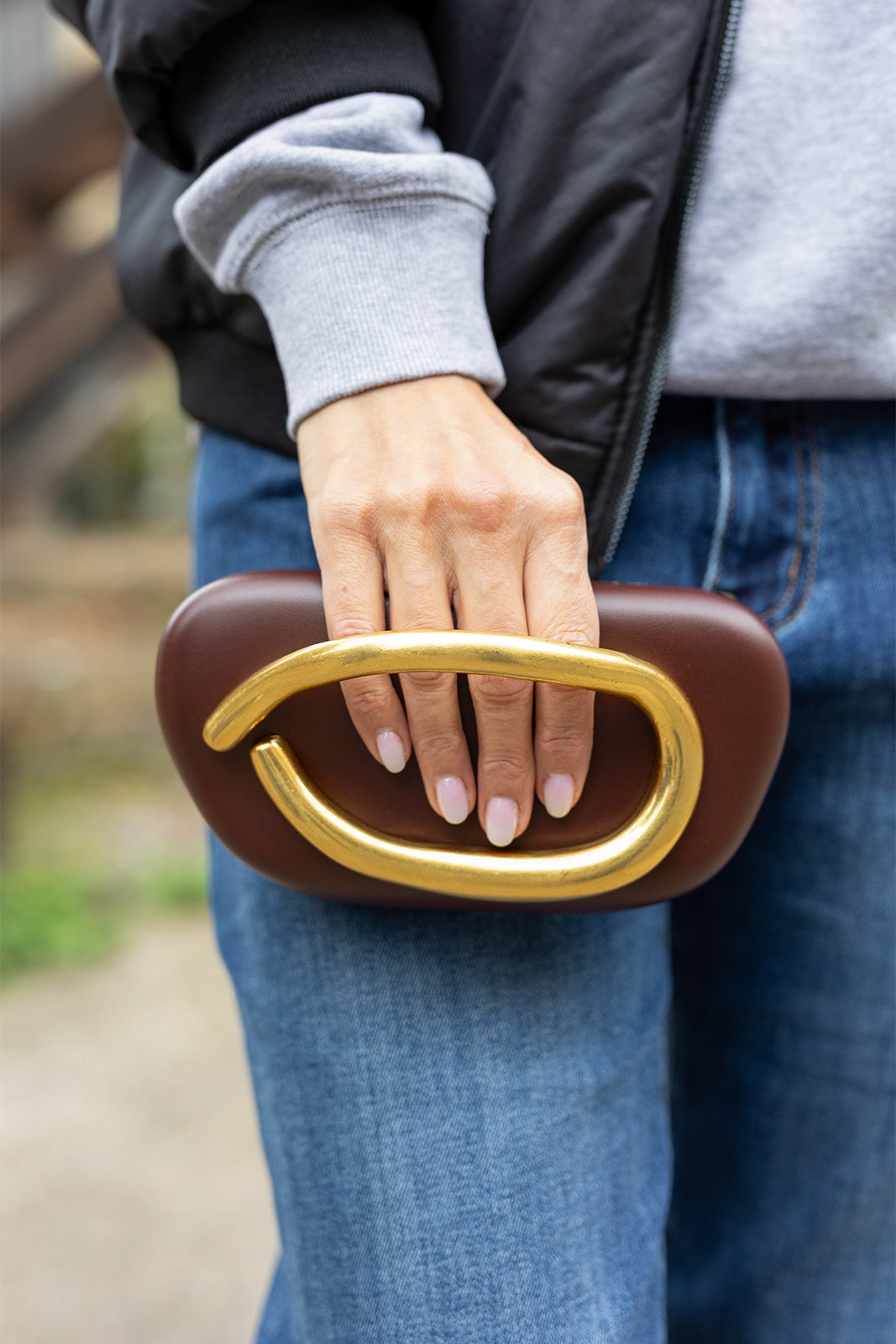 Ez a különleges, arany fogantyús mini táska a letisztult elegancia megtestesítője. A barna vegán bőr és az arany részletek kifinomult harmóniája luxusérzetet kelt, miközben modern, szoborszerű formája igazán egyedivé teszi. Kézben tartva vagy kiegészítőként viselve egyaránt stílusos választás, legyen szó alkalmi vagy hétköznapi megjelenésről. Kompakt mérete ellenére minden fontos apróság elfér benne. Ez a táska tökéletes kiegészítő azok számára, akik szeretik az elegáns, mégis karakteres darabokat.