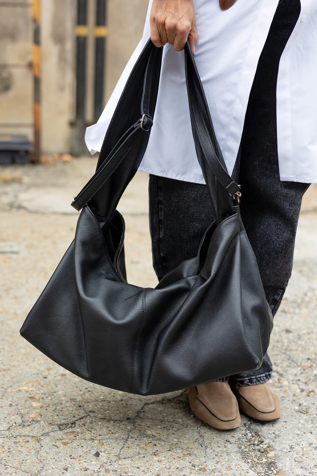 Ez a fekete, puha bőr táska tökéletes kombinációja a praktikumnak és a modern eleganciának. A laza, mégis strukturált fazon divatos és kényelmes viseletet kínál a mindennapokra. Állítható pántjai révén többféleképpen hordható, vállon vagy kézben is. A minőségi anyag és letisztult forma időtálló megjelenést biztosít, így bármilyen stílushoz könnyen illeszthető. Ideális választás, ha egy stílusos, ugyanakkor funkcionális táskát keresel a hétköznapokra.