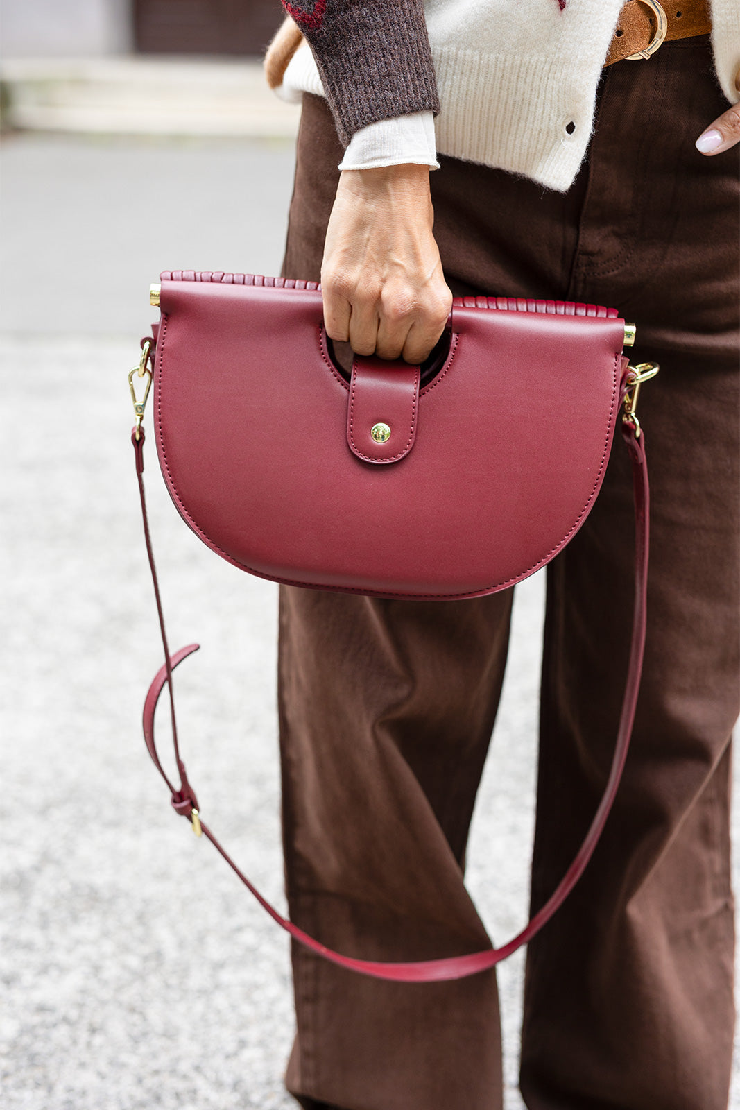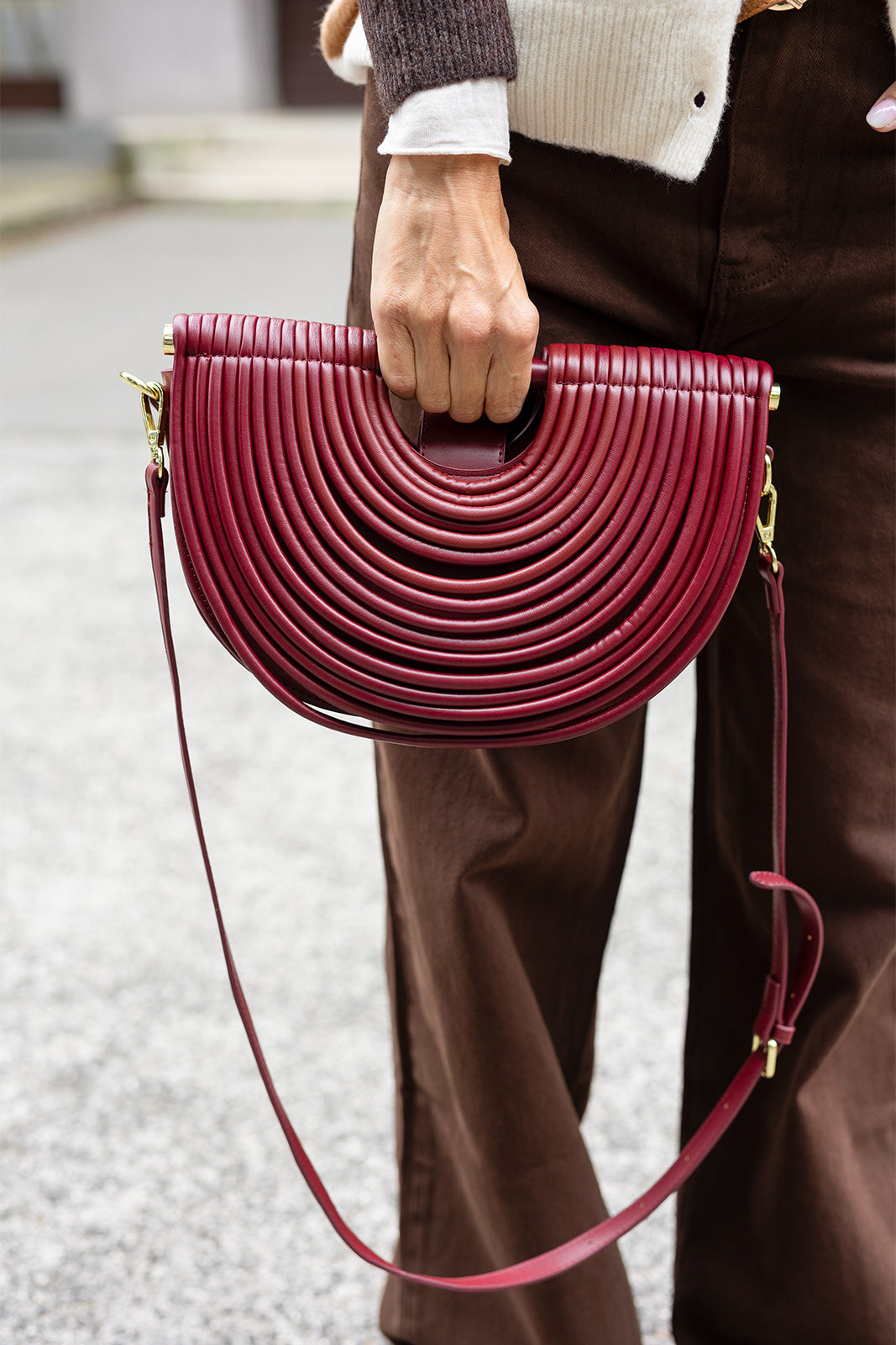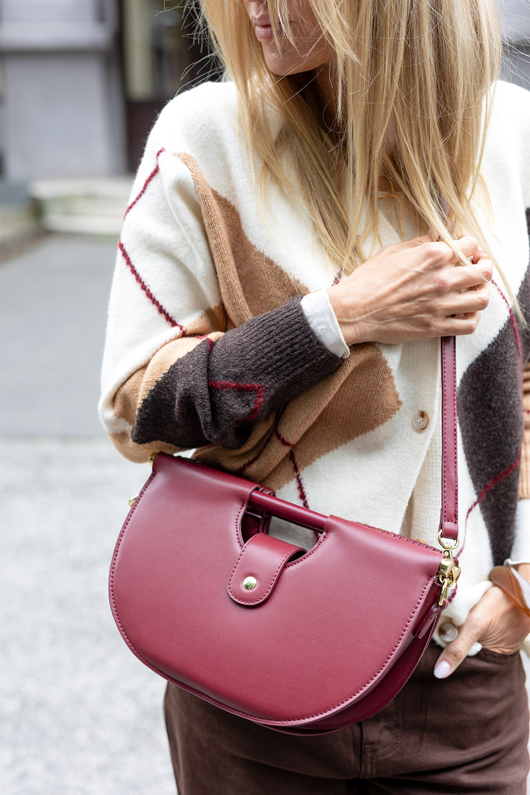 Ez a különleges kialakítású, bordó vegán bőr táska félkör alakú formájával és körkörös varrási mintázatával azonnal magára vonja a figyelmet. A prémium minőségű vegán bőr elegáns megjelenést biztosít, miközben a táska praktikus mérete miatt ideális hétköznapi és alkalmi viselethez is. Arany színű fém részletei és állítható vállpántja tovább fokozzák a luxus érzetét. Tökéletes kiegészítő lehet mindazok számára, akik szeretik az egyedi, mégis időtálló divatot. Kiválóan illik letisztult, elegáns vagy akár bohém stílusú öltözékekhez is.