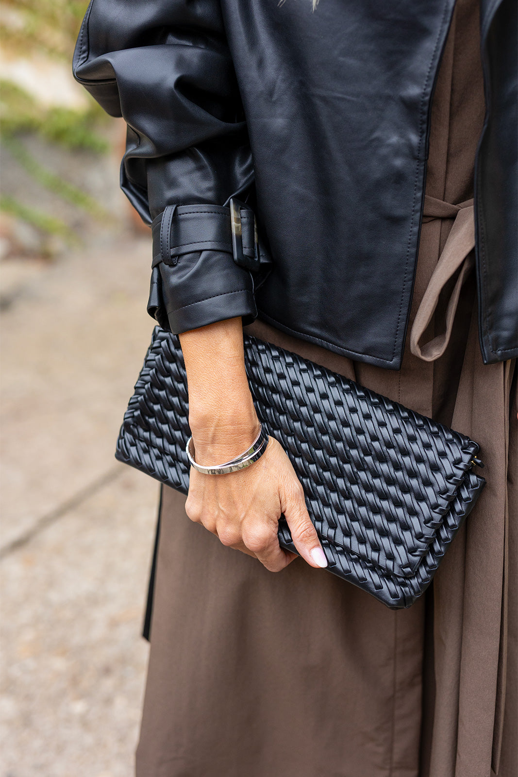 Ez az elegáns, fekete fonott borítéktáska a kifinomult stílus kedvelőinek tökéletes választása. Prémium minőségű, lágy tapintású műbőrből készült, amely egyszerre modern és időtálló. A strukturált, fonott felület különleges textúrát ad, miközben kompakt mérete ideális alkalmi eseményekre vagy esti programokra. Kézben tartva elegáns megjelenést biztosít, de diszkréten elfér minden fontos apróság. Ez a táska bármely outfitet képes stílusosan kiegészíteni, legyen szó hétköznapi eleganciáról vagy esti megjelenésről.