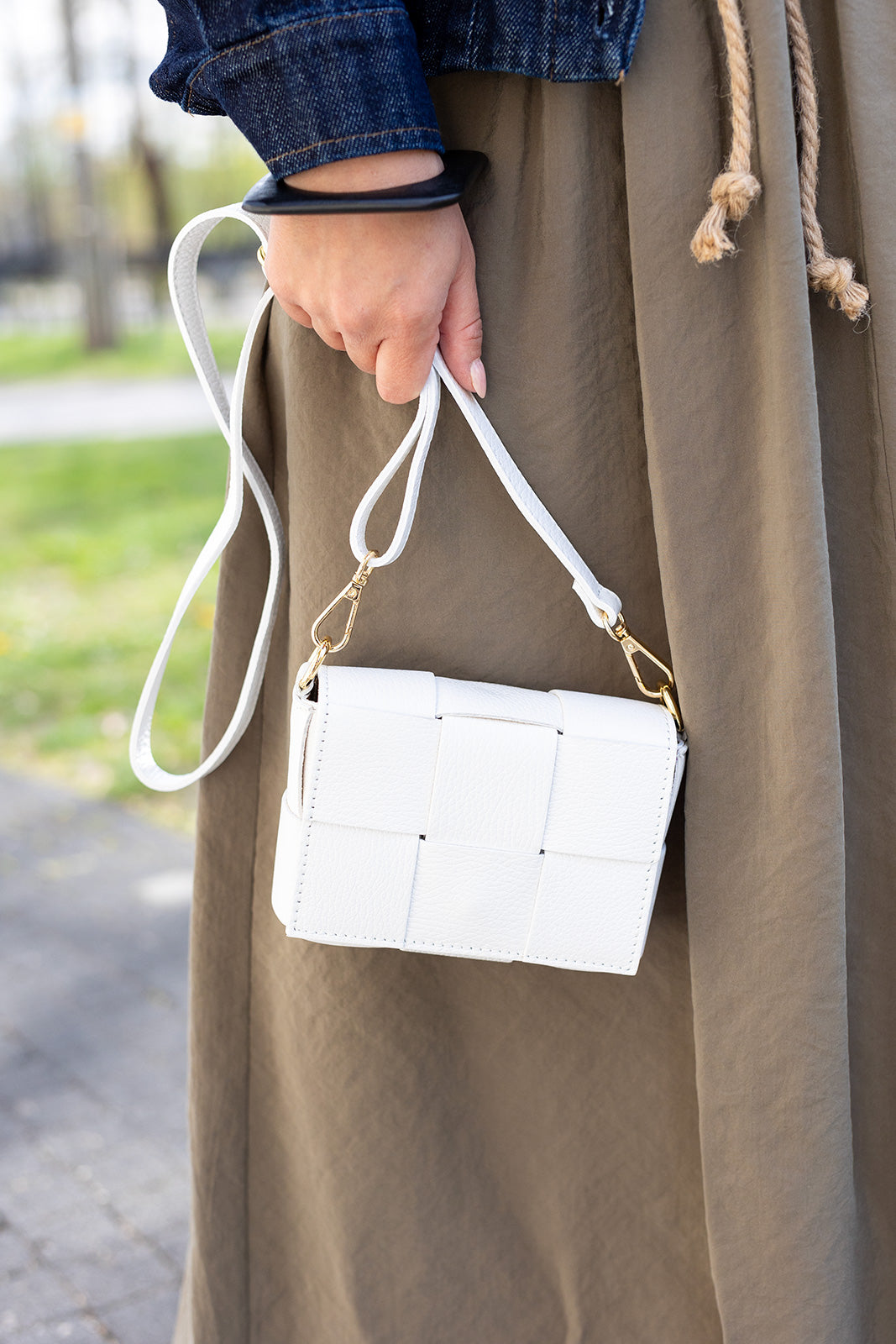 Ez a barna, fonott hatású bőr válltáska stílusos és praktikus kiegészítő. Kompakt mérete ellenére elegendő helyet biztosít a legfontosabb személyes tárgyaknak. Kiváló minőségű, texturált anyaga időtálló és elegáns megjelenést nyújt. Aranyszínű fém részletei finom, nőies kontrasztot adnak a sötét árnyalatnak. Tökéletes választás mindennapi használatra, városi sétákhoz vagy esti programokhoz.