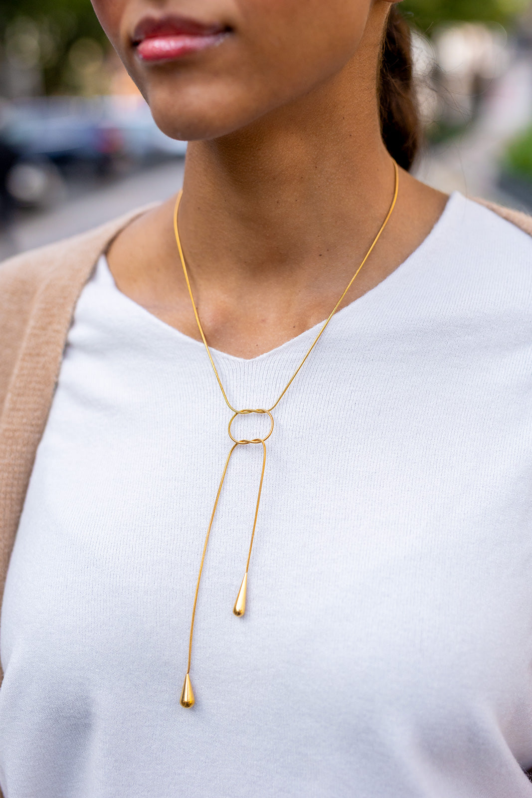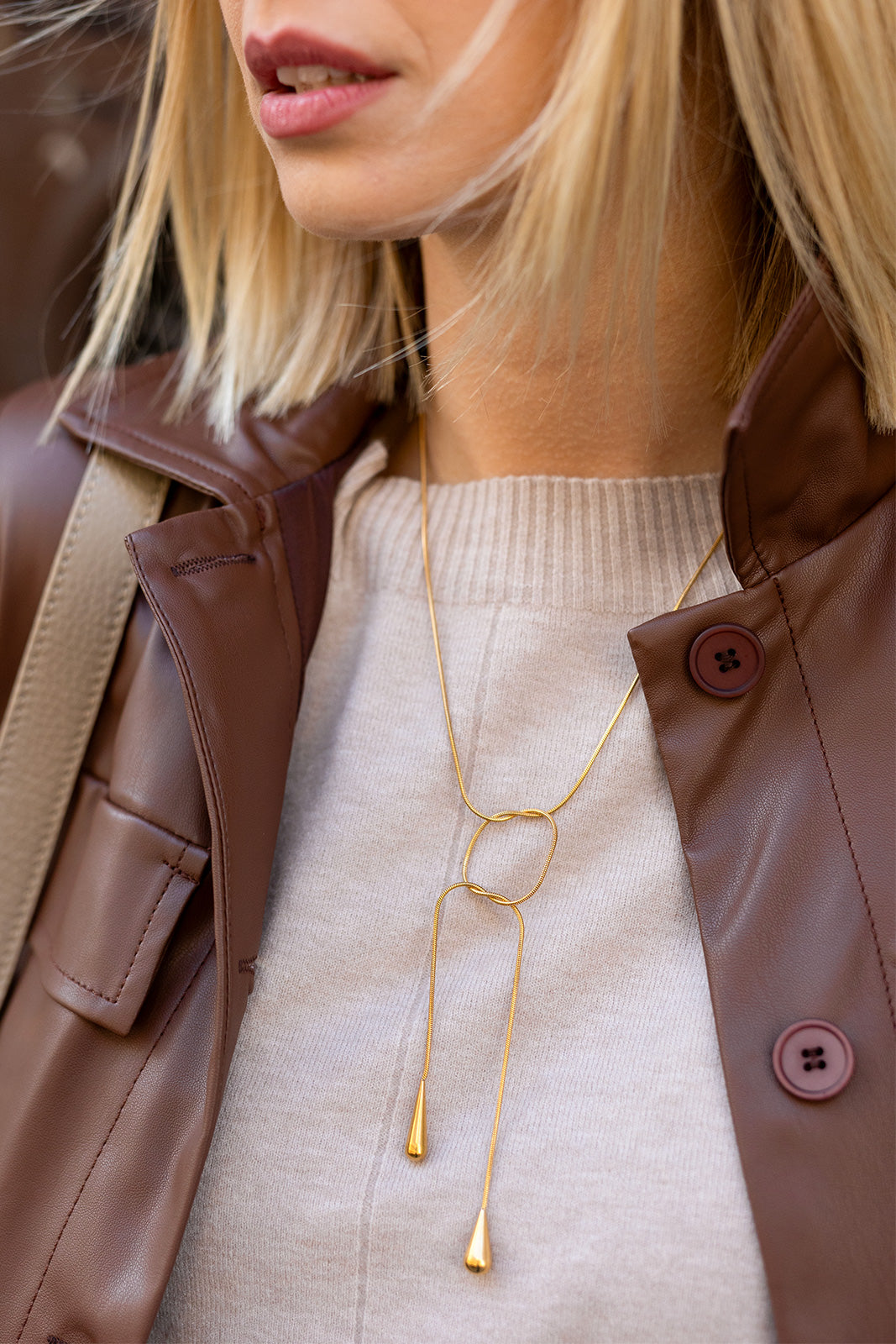 Ez az elegáns, hosszú aranyszínű nyaklánc minimalista formavilágával a modern stílus kedvelőinek készült. A kecses, vékony láncot két csepp alakú függő díszíti, amelyek lágyan mozognak minden lépésnél. Letisztult dizájnja miatt remekül illik hétköznapi outfitekhez, de különleges alkalmakhoz is kifinomult kiegészítő. Könnyedén párosítható más ékszerekkel, mégis önmagában is karakteres darab. Tökéletes választás azoknak, akik egyszerre keresnek visszafogott, mégis látványos kiegészítőt.
