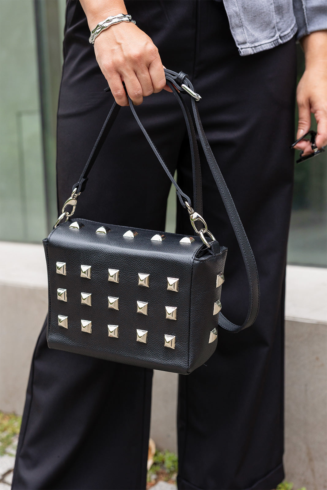 Ez a prémium minőségű fekete bőr táska igazi statement darab, amely feldobja bármely outfitet. Elegáns, mégis vagány megjelenését a feltűnő, fényes szegecsdíszítés teszi egyedivé. Kompakt mérete praktikus, mégis elegendő helyet biztosít a mindennapi szükségleteknek. Tartós bőr anyaga hosszú élettartamot és időtlen stílust garantál. Ideális választás azoknak, akik szeretik az eleganciát egy kis rockos csavarral.
