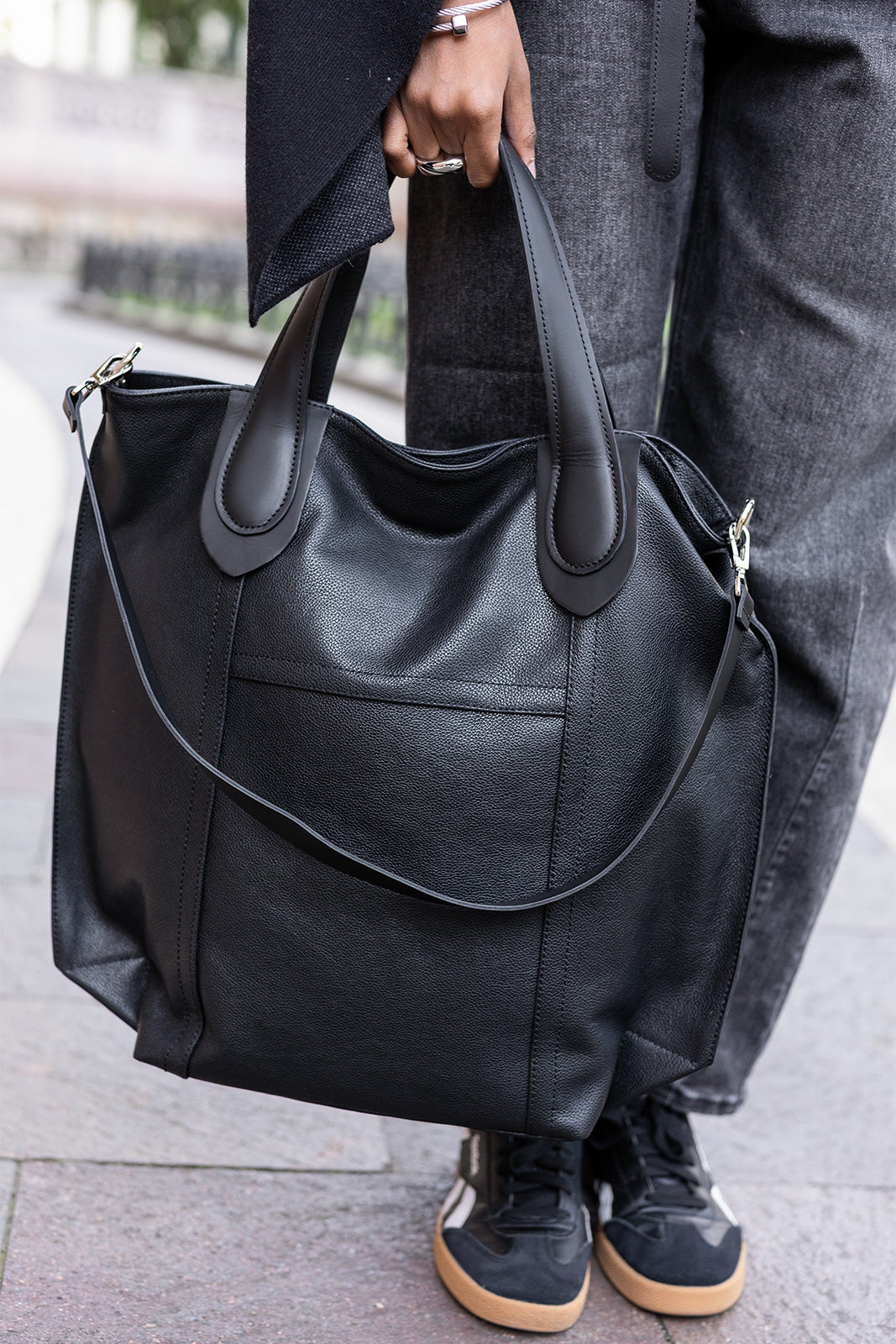 Ez a prémium minőségű fekete bőr táska elegáns és időtálló kiegészítő, amely tökéletesen illik mindennapi és alkalmi viseletekhez egyaránt. Tágas belső kialakítása biztosítja, hogy minden szükséges holmid kényelmesen elférjen benne, míg a masszív, erős bőr anyag hosszú élettartamot garantál. Praktikus kézi- és vállpánttal is rendelkezik, így többféleképpen hordható. Minimalista, letisztult dizájnja könnyedén kombinálható bármilyen színnel és stílussal, ezért igazi alapdarab lehet a ruhatáradban. Ez a prémium bőr táska a stílus, a funkcionalitás és a tartósság tökéletes harmóniáját kínálja.