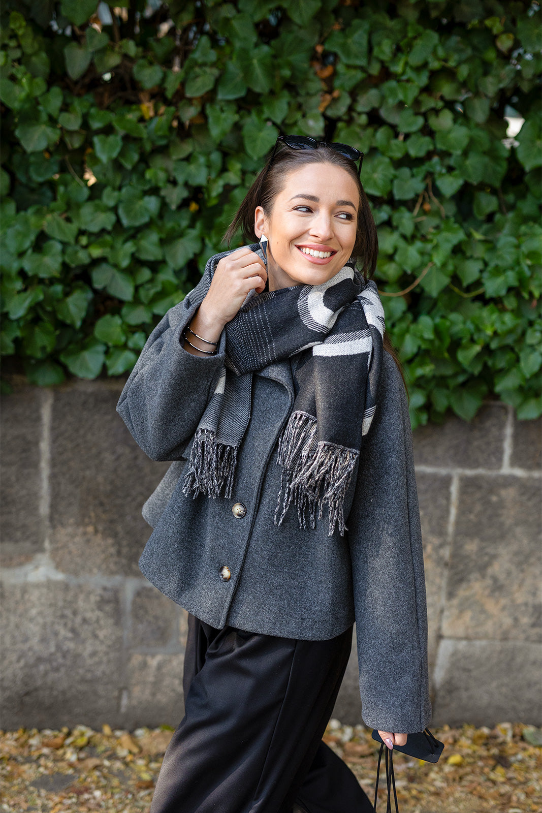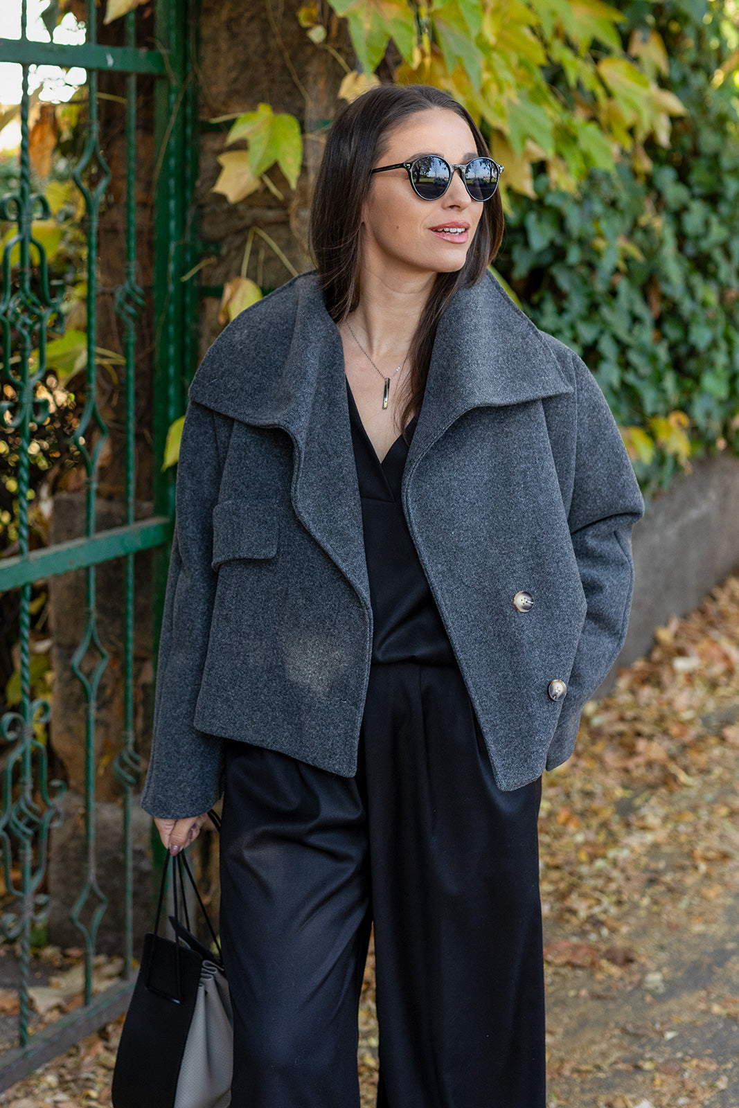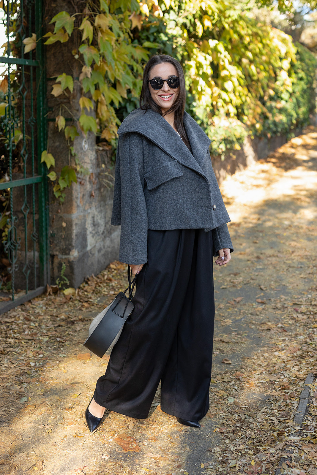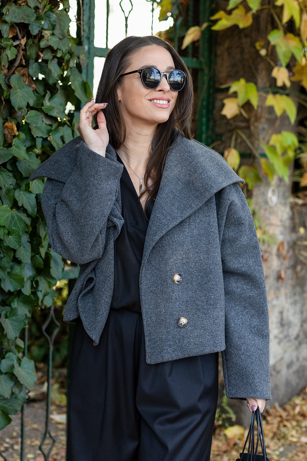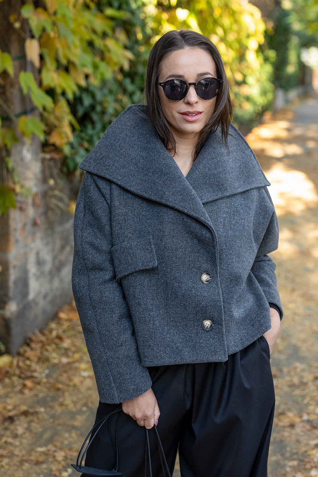Ez a Black Label kollekciós kabát a letisztult elegancia megtestesítője. Kiváló minőségű, meleg anyagból készült, így ideális választás a hűvös őszi és téli napokra. A rövid, kissé A-vonalú fazon nőies sziluettet kölcsönöz, míg a karakteres, széles gallér és a fémgombos záródás modern, mégis klasszikus megjelenést biztosít. Könnyedén kombinálható elegáns vagy hétköznapi szettekkel egyaránt. Egy prémium, időtálló darab, amely minden stílusos nő ruhatárában megállja a helyét.