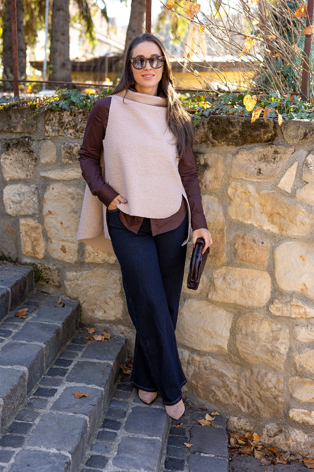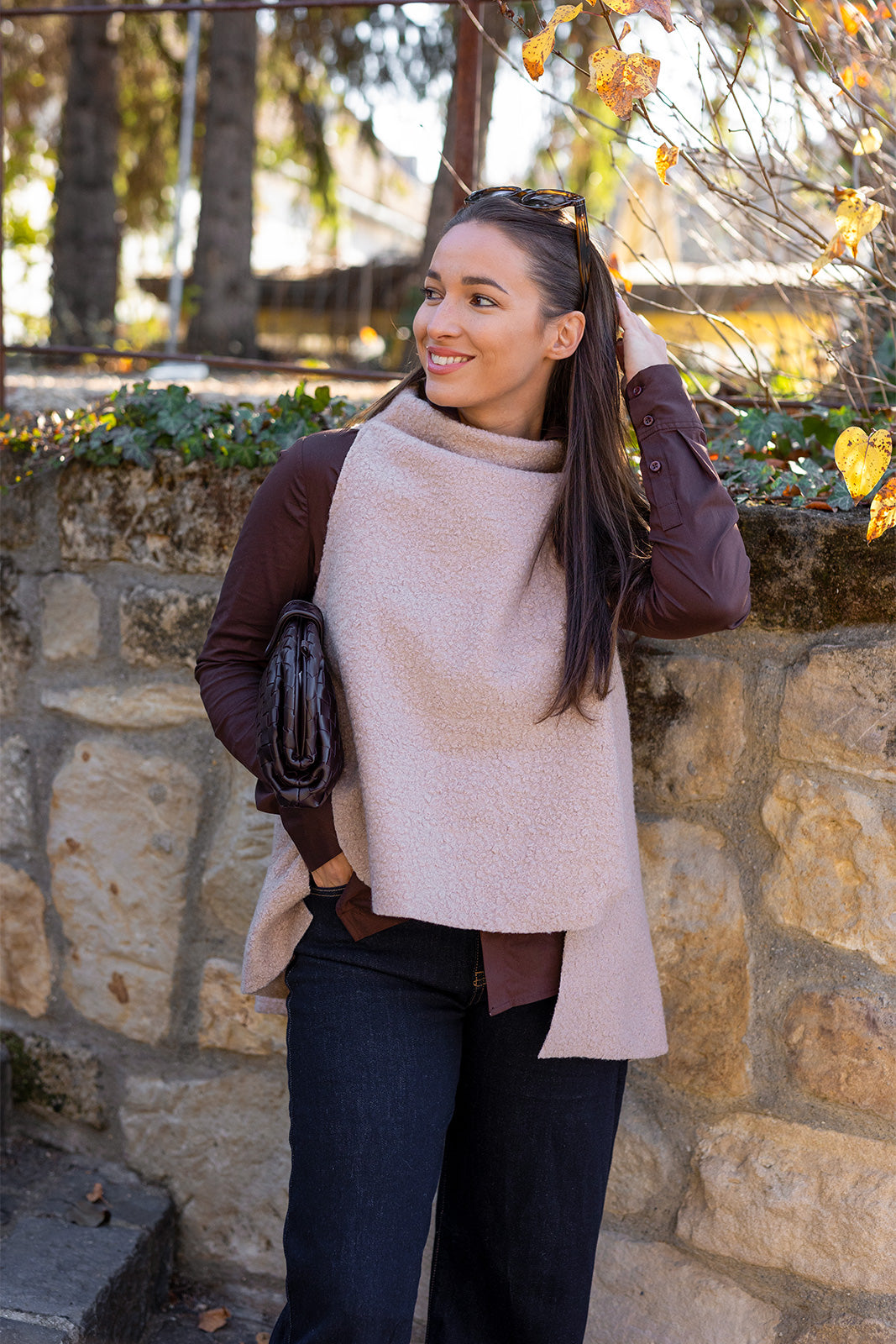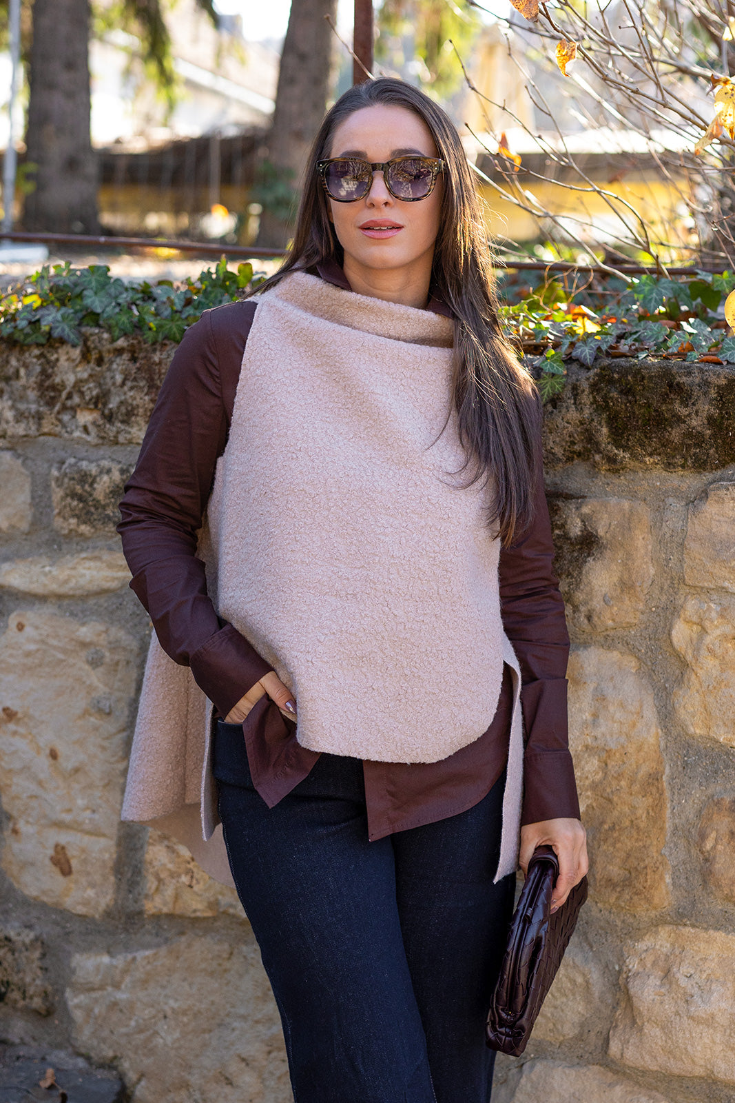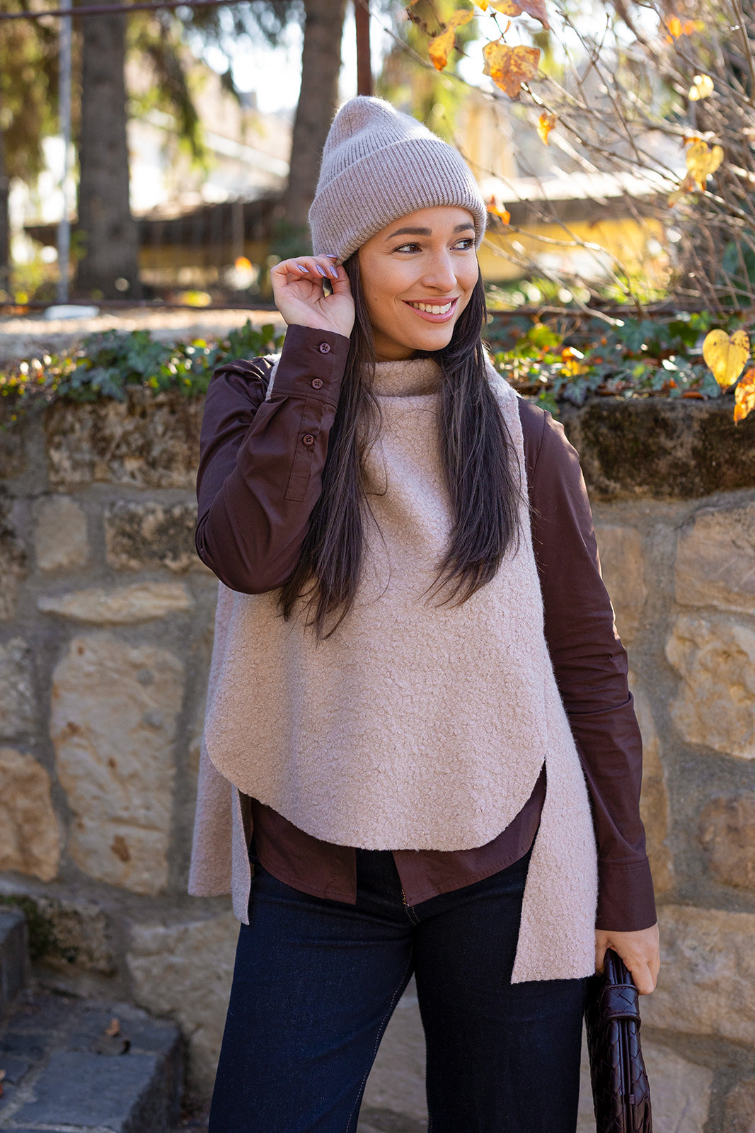 Ez a púder színű buklé mellény a réteges öltözködés egyik legstílusosabb darabja. Puha, meleg tapintású anyaga kellemes viselet a hűvösebb napokon, miközben modern, aszimmetrikus szabása és oldalt nyitott kialakítása játékos, mégis kifinomult megjelenést biztosít. Ideális ingre, garbóra vagy vékony pulóverre rétegezve – tökéletes választás az őszi-téli szezon elegáns, de lezser szettjeihez.