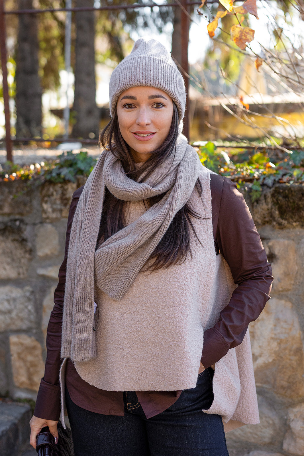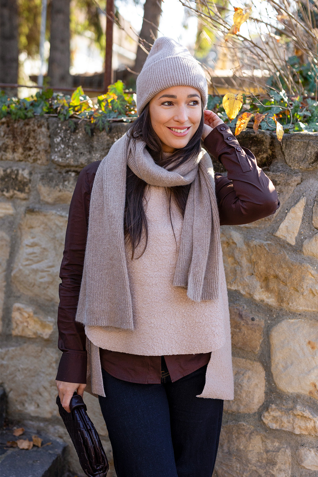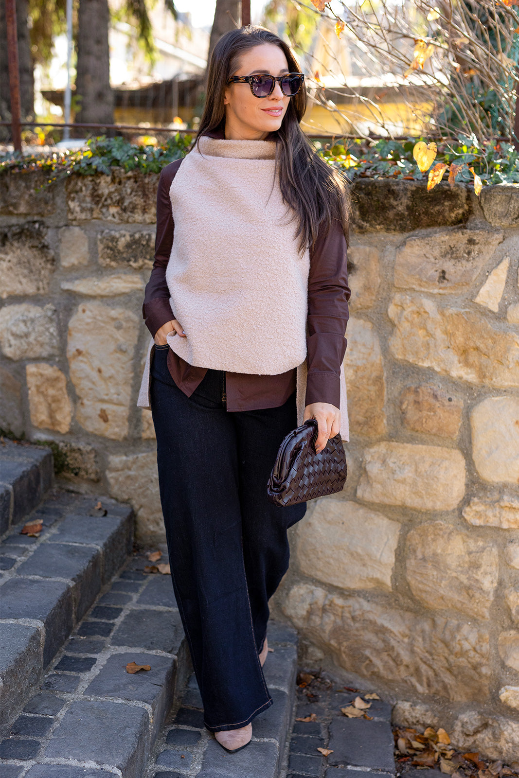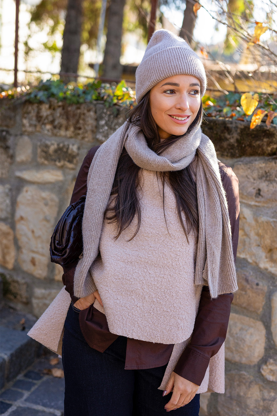 Ez a púder színű buklé mellény a réteges öltözködés egyik legstílusosabb darabja. Puha, meleg tapintású anyaga kellemes viselet a hűvösebb napokon, miközben modern, aszimmetrikus szabása és oldalt nyitott kialakítása játékos, mégis kifinomult megjelenést biztosít. Ideális ingre, garbóra vagy vékony pulóverre rétegezve – tökéletes választás az őszi-téli szezon elegáns, de lezser szettjeihez.