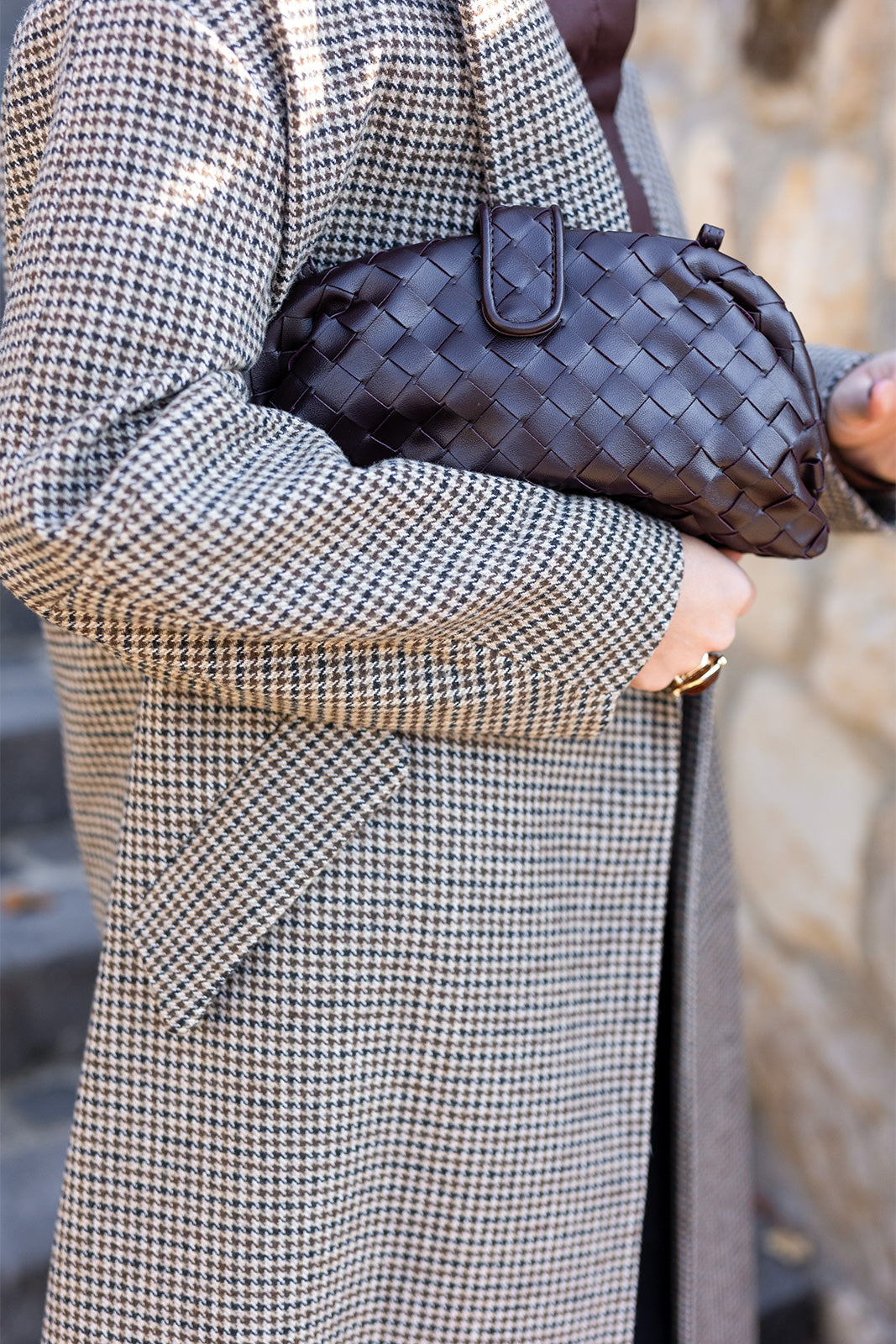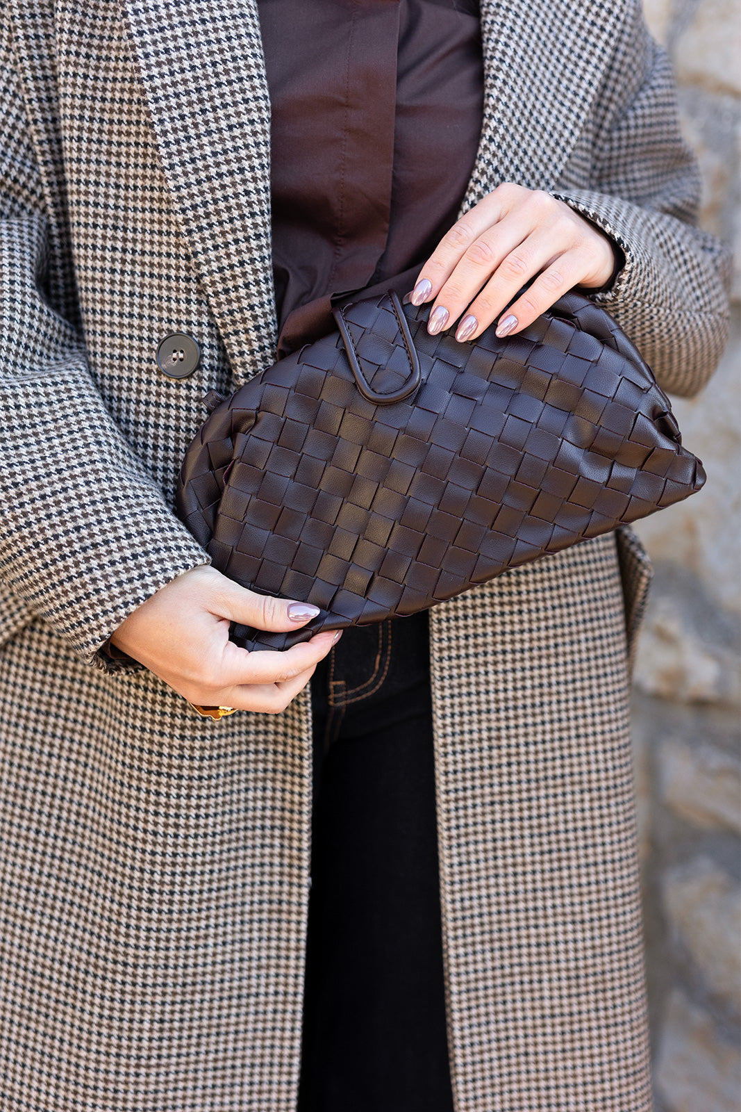 Ez a fonott vegán bőr clutch táska a stílusos minimalizmus megtestesítője. Prémium minőségű, puhán strukturált valódi bőrből készült, amely időtálló eleganciát és finom fényt biztosít. A táska kézzel szőtt mintázata különleges textúrát ad, míg a kompakt méret tökéletes választás esti programokhoz vagy elegáns nappali megjelenéshez. Egyszerre modern és klasszikus darab, amely bármilyen szettet feldob.