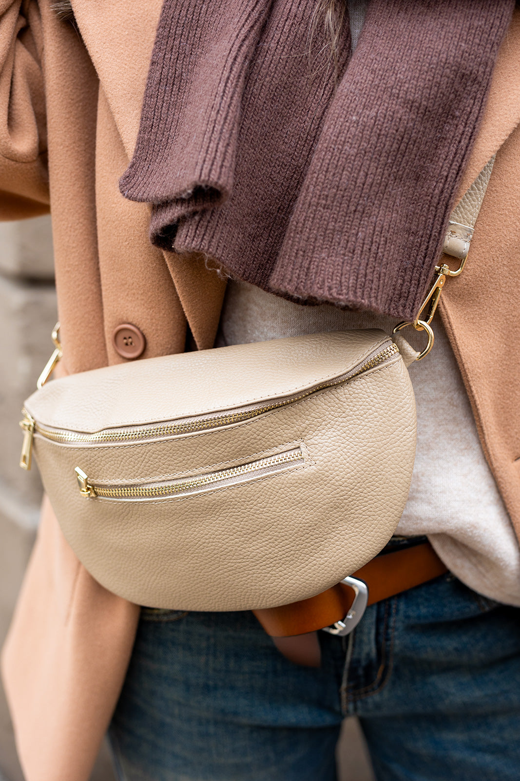 Ez a világos árnyalatú bőr táska letisztult és nőies kiegészítő, amely finoman emeli az összhatást.