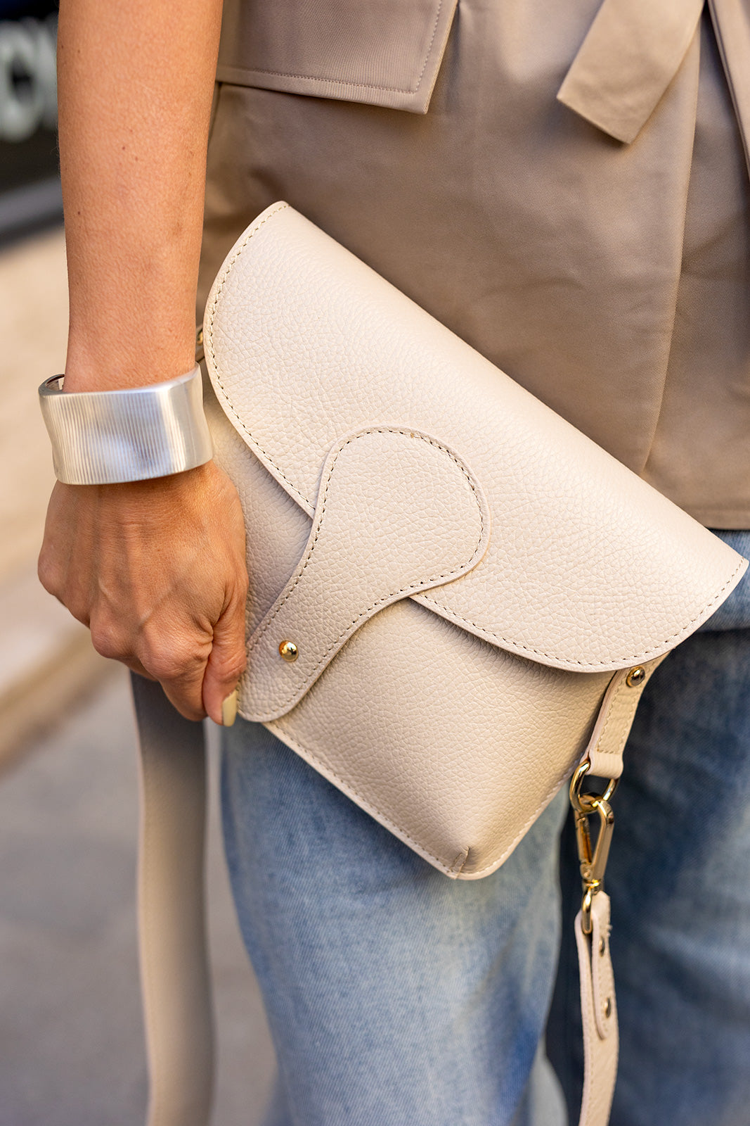 Ez a bézs bőr táska a letisztult elegancia és a praktikus funkcionalitás tökéletes kombinációja. Finoman strukturált valódi bőr felülete prémium megjelenést biztosít, míg az íves fedél kialakítás modern, nőies karaktert ad a darabnak. Kompakt mérete ideálissá teszi mindennapi használatra vagy alkalmi megjelenések kiegészítésére. Állítható pántjának köszönhetően kézben tartva vagy vállon viselve is stílusos választás. Aranyszínű fém részletei elegáns hangsúlyt adnak a neutrális árnyalatnak. Egy időtálló női bőr táska, amely könnyedén illeszkedik kapszulagardróbba és városi outfitekhez egyaránt.