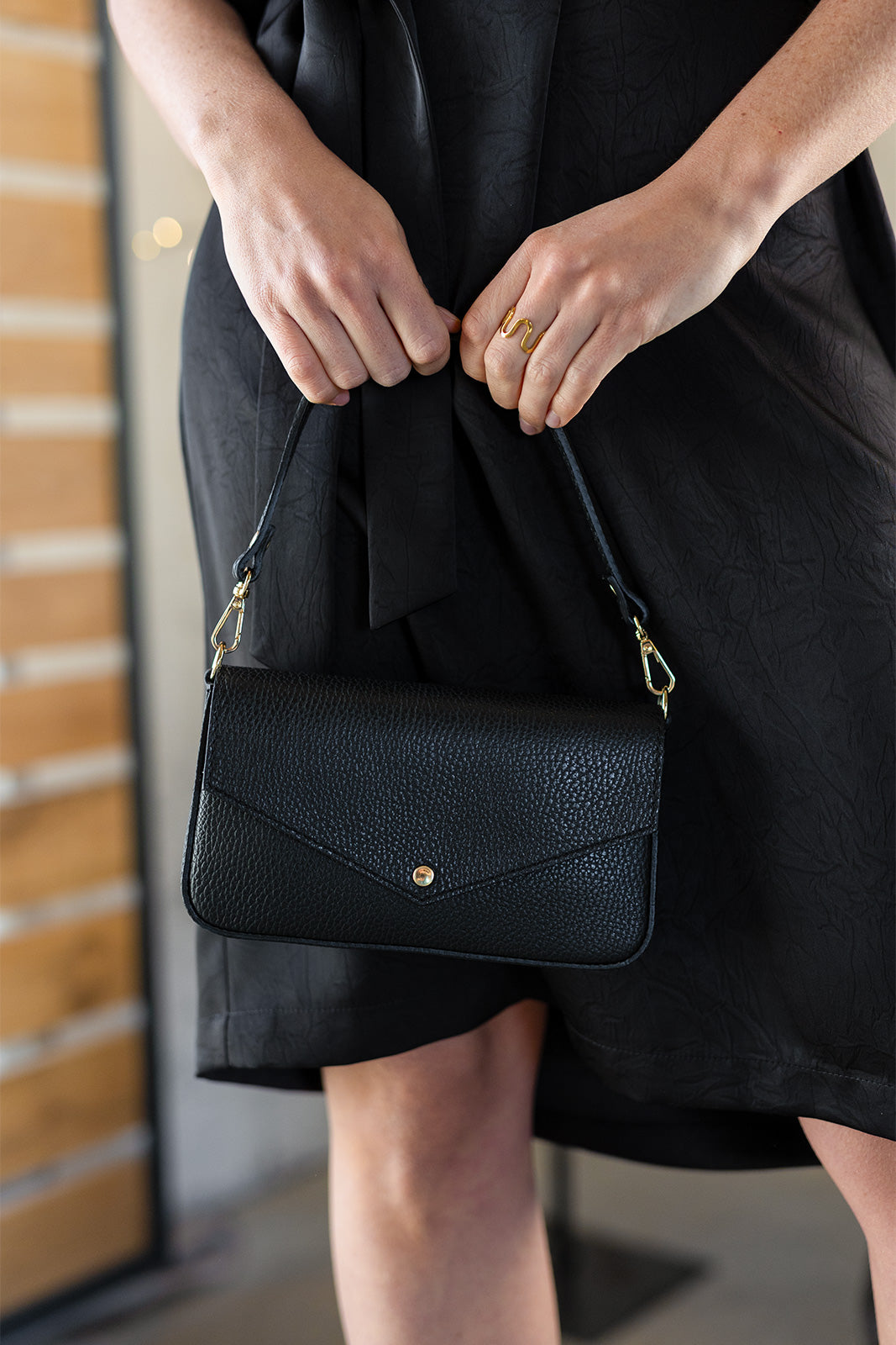 Ez a prémium minőségű, valódi bőrből készült fekete táska a letisztult elegancia és praktikum tökéletes kombinációja. Finoman strukturált felülete és aranyszínű fém részletei igazán kifinomult megjelenést kölcsönöznek. Kompakt mérete miatt remek választás alkalmi eseményekre vagy hétköznapi elegáns összeállításokhoz is. A levehető pántnak köszönhetően kézben és vállon is kényelmesen hordható. Minden alapvető holmi elfér benne, miközben megőrzi modern, minimalista karakterét — egy időtálló darab, amely könnyedén a kedvenc kiegészítőd lehet.