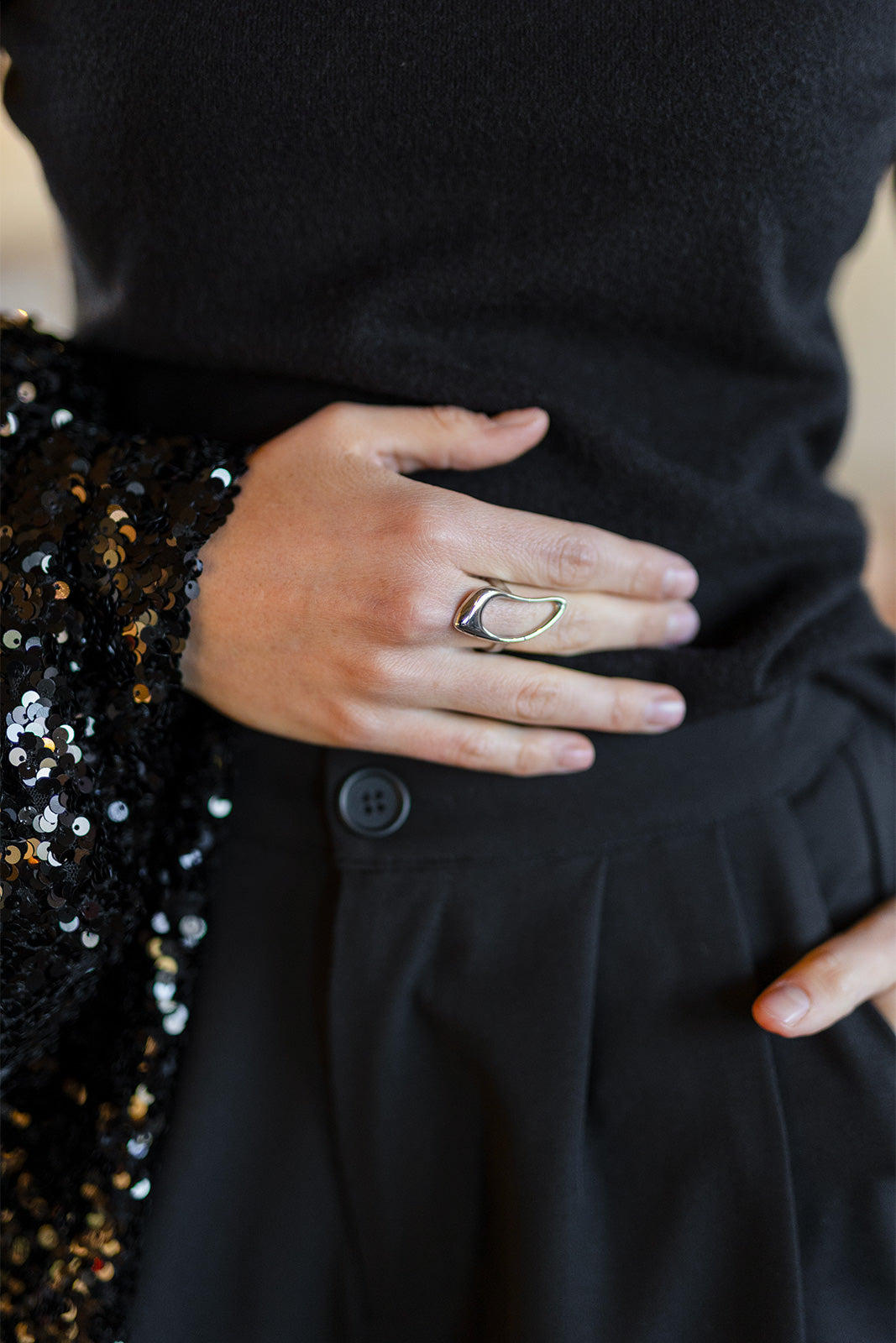 Ez a gyűrű modern, letisztult formavilágával a minimalista elegancia tökéletes kiegészítője. Organikus, lágy vonalvezetése finoman körbefogja az ujjat, így egyszerre különleges és visszafogott megjelenést biztosít. Fényes felülete gyönyörűen tükrözi a fényt, ezért alkalmi és hétköznapi összeállításokhoz is remek választás. Kényelmes, könnyű viselet, amely egész nap harmonikusan illeszkedik a kéz természetes mozgásához. Ideális ajándék azoknak, akik szeretik az időtálló, mégis karakteres ékszereket.