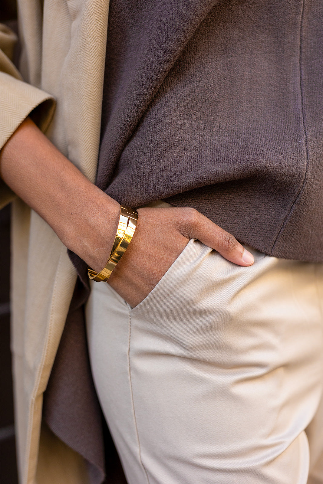 Ez a letisztult, aranyszínű karkötő elegáns kiegészítője bármely szettnek. Fényes felülete modern, mégis időtlen megjelenést kölcsönöz, így tökéletes választás mindennapi viselethez és alkalmi eseményekre is. Kialakítása kényelmes és könnyen viselhető, akár önmagában, akár más ékszerekkel kombinálva. Minimalista stílusának köszönhetően remekül illik klasszikus, üzleti vagy hétköznapi outfitekhez is.