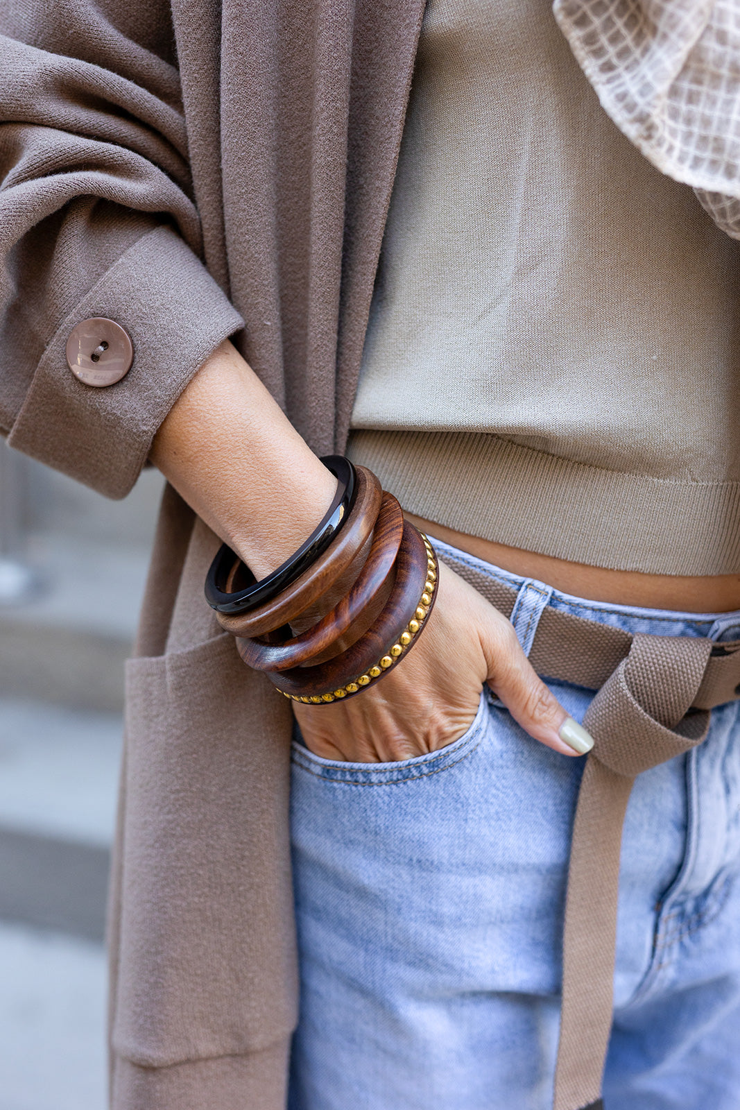 Ez a többsoros női karkötő szett természetes eleganciájával és karakteres megjelenésével különleges hangsúlyt ad bármely outfitnek. A fa hatású elemek, a fényes fekete karkötő és az aranyszínű gyöngysoros rész harmonikus kontrasztot alkotnak, így egyszerre modern és időtálló kiegészítő. Réteges kialakítása önmagában is látványos, de más ékszerekkel kombinálva is stílusos megjelenést biztosít. Tökéletes választás hétköznapi és elegáns szettekhez egyaránt. Természetes tónusainak köszönhetően könnyen illeszthető kapszulagardrób darabjaihoz. Egy sokoldalú női karkötő szett, amely karaktert és melegséget visz a megjelenésbe.