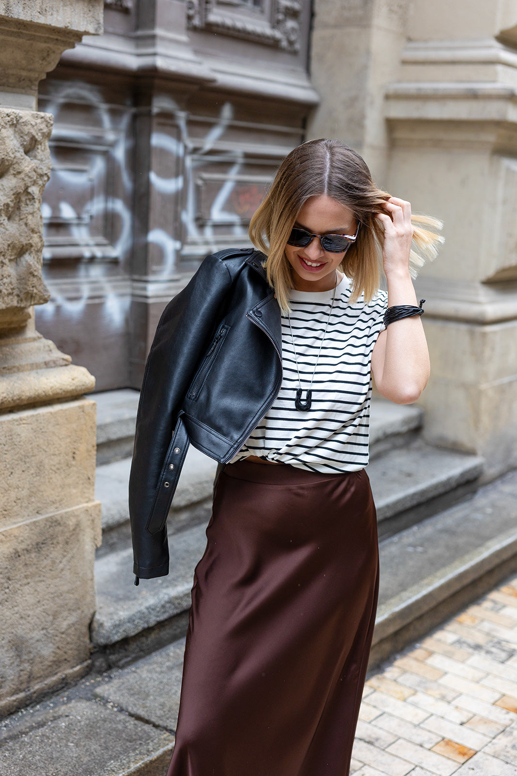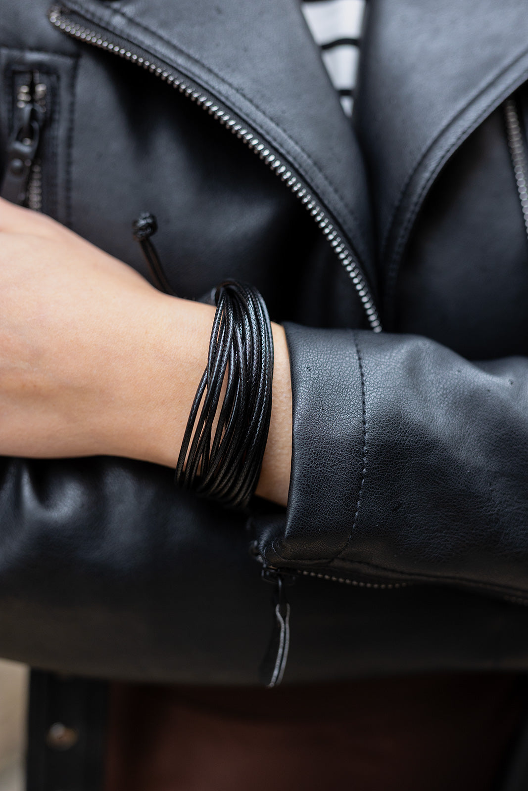 Ez a fekete bőr karkötő letisztult, mégis karakteres kiegészítő, amely finoman erősíti a modern, városi megjelenést. Többszálas kialakítása izgalmas textúrát ad a csuklónak, miközben könnyedén illeszkedik elegáns és casual szettekhez is.