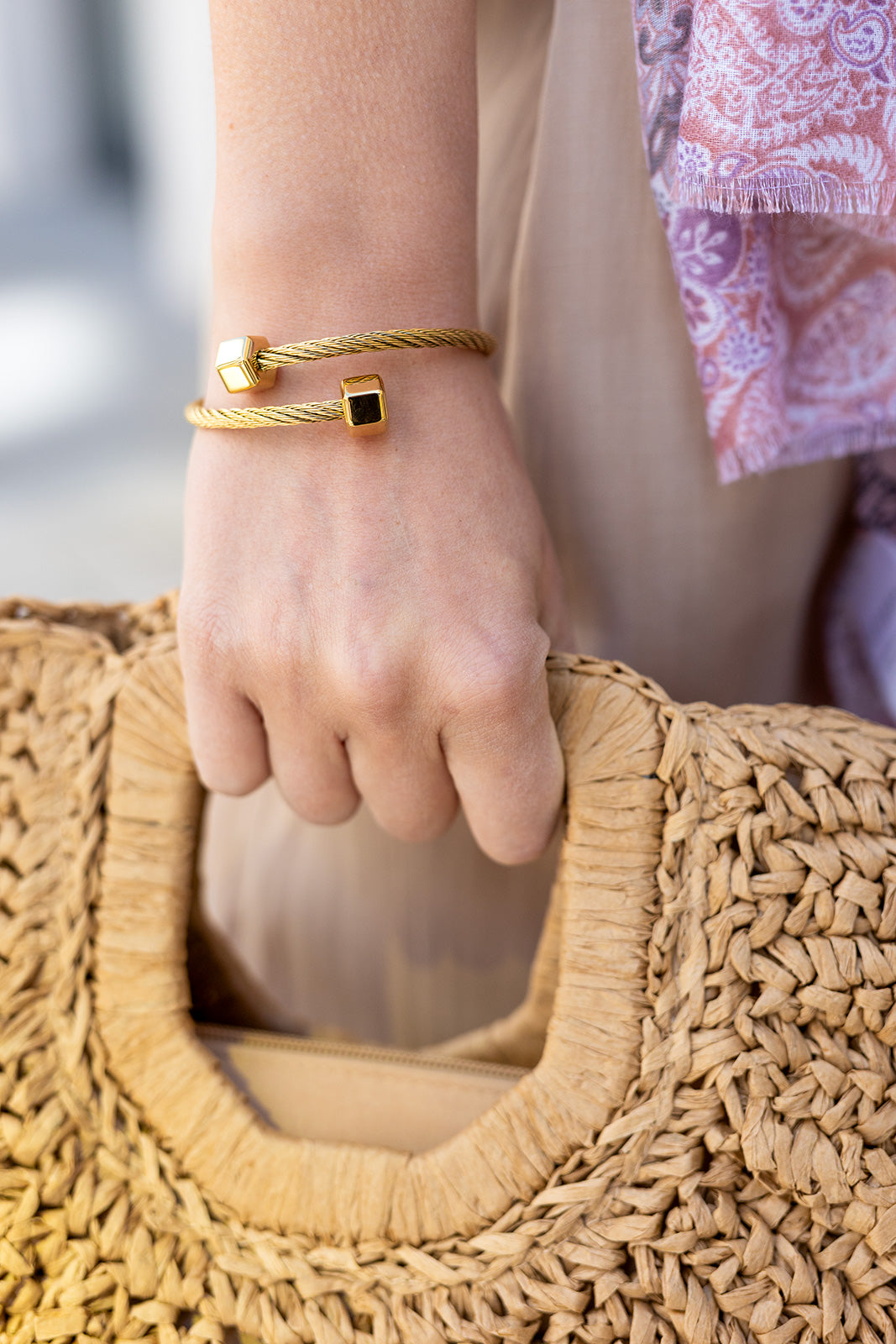 Ez az elegáns acél karkötő minimalista, mégis karakteres kiegészítő, amely tökéletes választás mindennapi viselethez vagy alkalmi megjelenéshez. Rugalmas, fonott acél pántja modern és időtálló stílust képvisel, miközben a két végén található geometrikus, kocka alakú díszítés különleges részletet ad. Könnyen kombinálható más ékszerekkel, de önmagában is erőteljes, letisztult hatást kelt. Strapabíró kialakítása biztosítja a tartósságot, így hosszú távon is megőrzi fényét és formáját. Ez a karkötő ideális választás azoknak, akik a letisztult, modern divatot kedvelik, és egy időtálló darabot keresnek kiegészítőként.