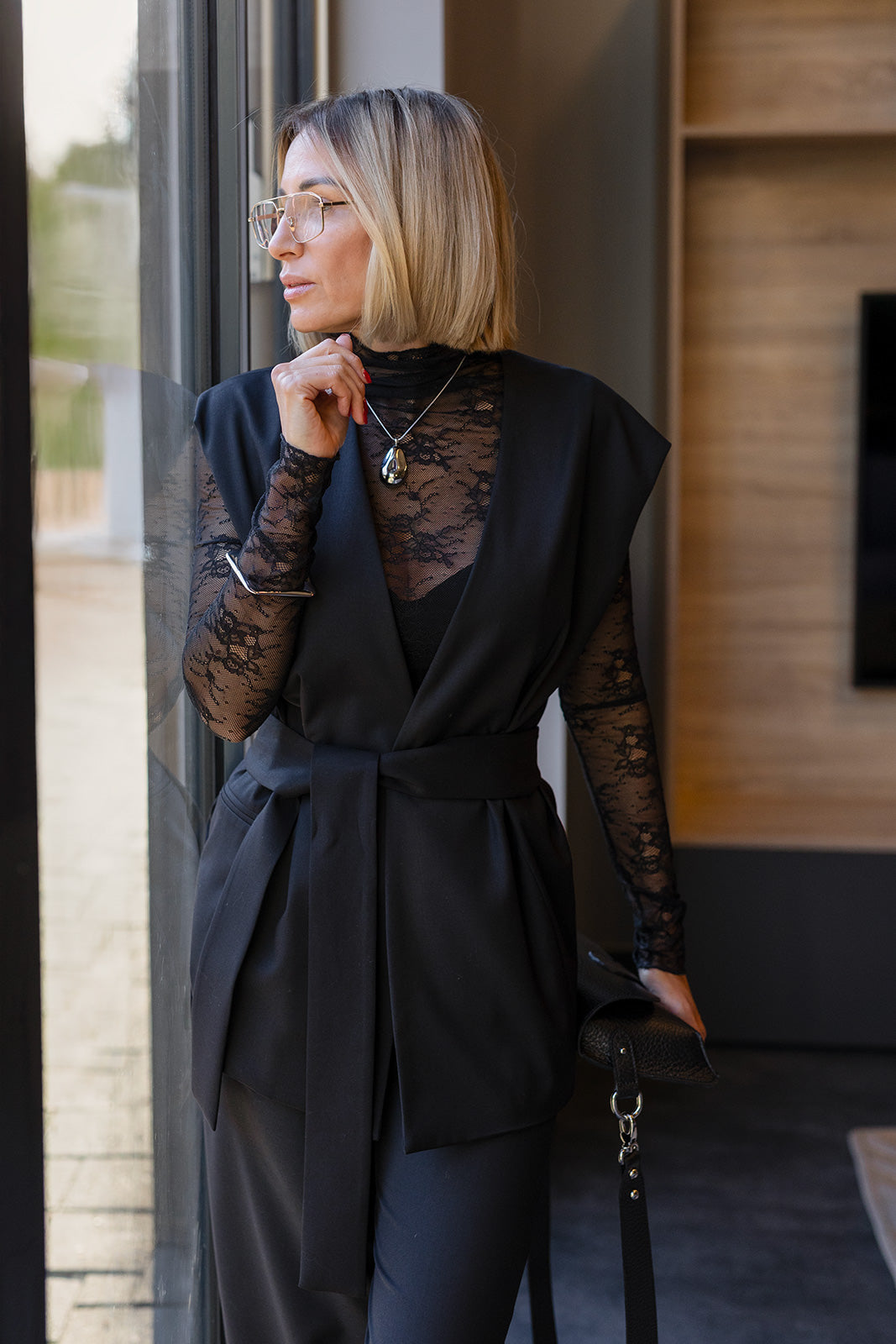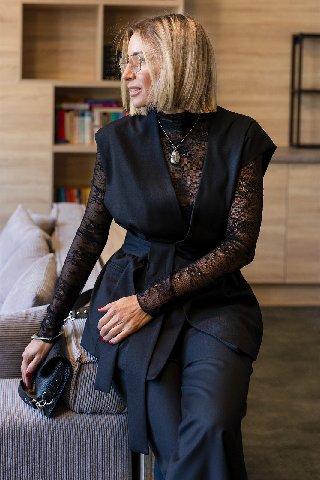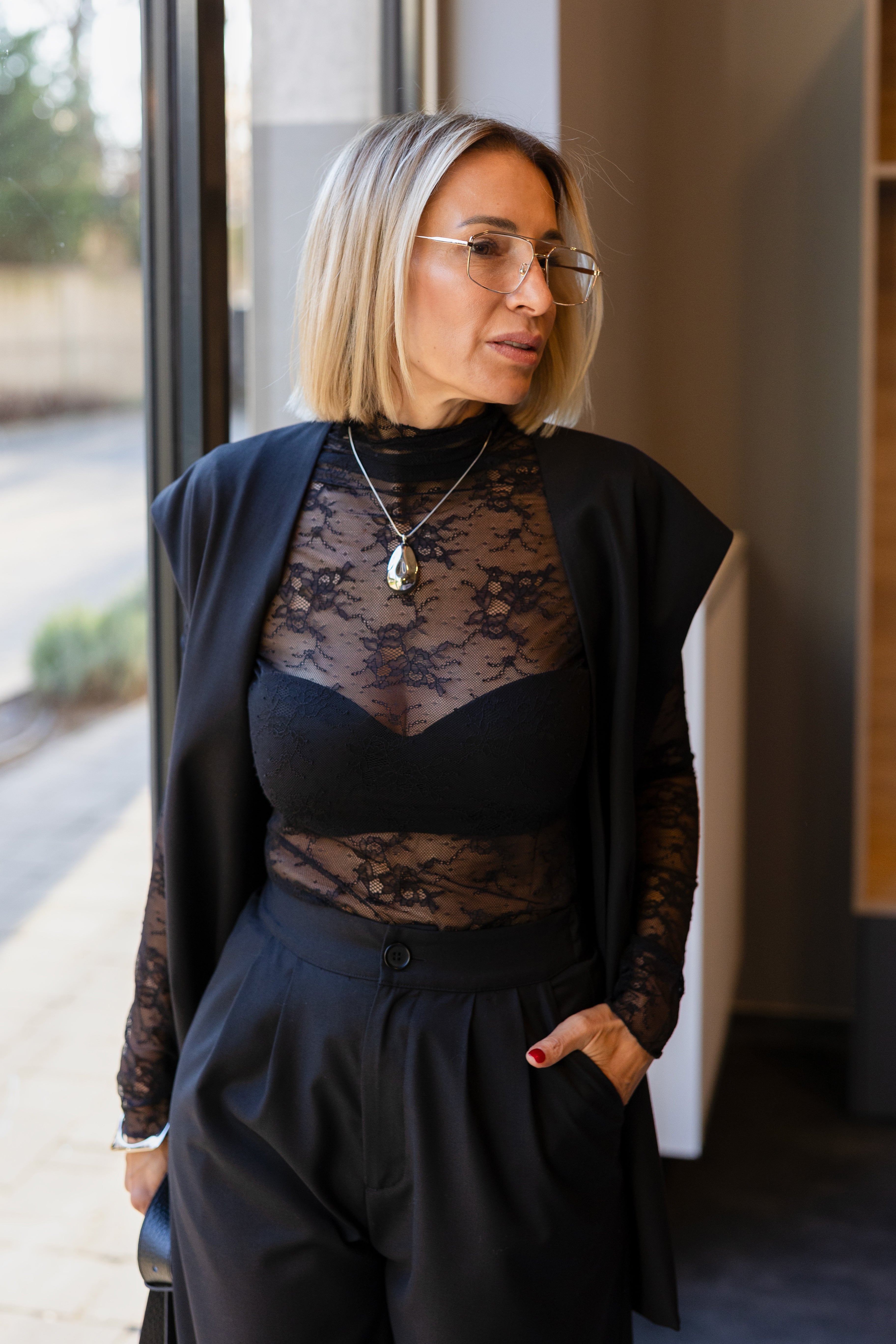Elegáns, mégis modern csipke felső, amely tökéletes választás különleges alkalmakra vagy egy stílusos esti összeállításhoz. Finoman áttetsző, finom mintázatú csipke anyaga nőies és kifinomult megjelenést kölcsönöz. Rugalmas, kellemes tapintású anyaga kényelmes viseletet biztosít egész nap. A magas nyakrész tovább fokozza a felső eleganciáját, miközben gyönyörűen kiemeli a váll- és dekoltázsrészt. Szűk fazonja önmagában és zakóval vagy mellénnyel kombinálva is mutatós. Tökéletes választás azok számára, akik szeretik a modern és nőies megjelenést.