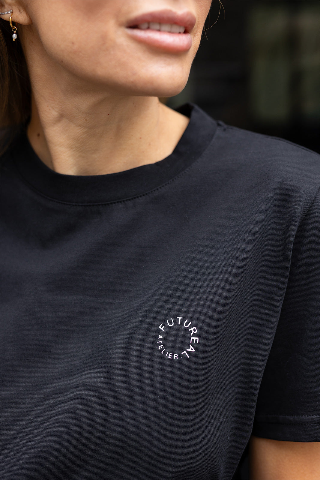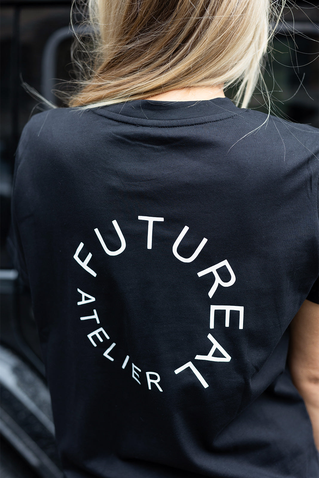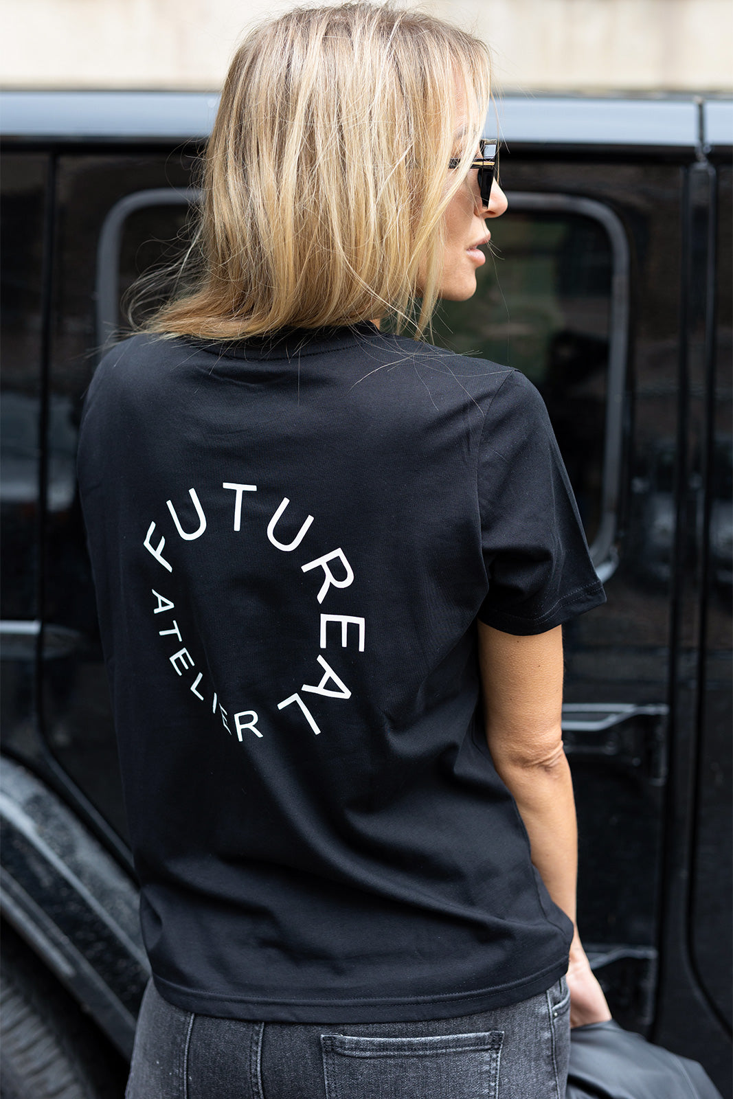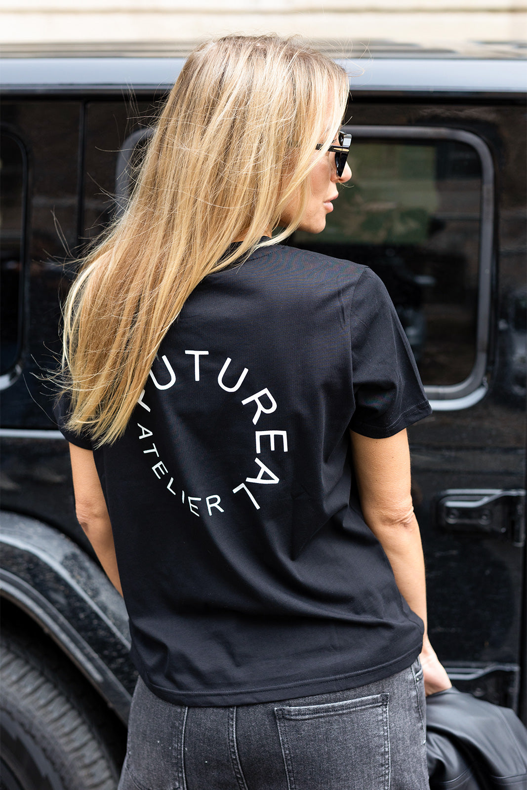 Ez a fekete rövid ujjú póló modern és laza stílust képvisel, hátoldalán látványos, körkörösen elhelyezett fehér „FUTURE ATELIER” felirattal. A kontrasztos grafika trendi, fiatalos megjelenést biztosít, amely tökéletesen illik hétköznapi outfitekhez. Kényelmes szabásának és pamut anyagának köszönhetően ideális választás mind városi sétákhoz, mind szabadidős programokra. A fekete póló könnyedén kombinálható farmerrel, bőrdzsekivel vagy sportos nadrággal. Egy univerzális darab, amely minden ruhatár alapját képezheti.