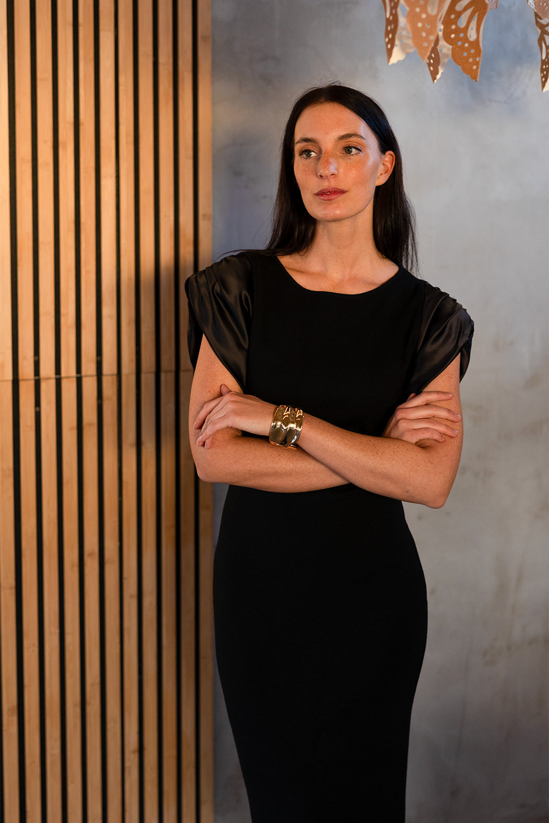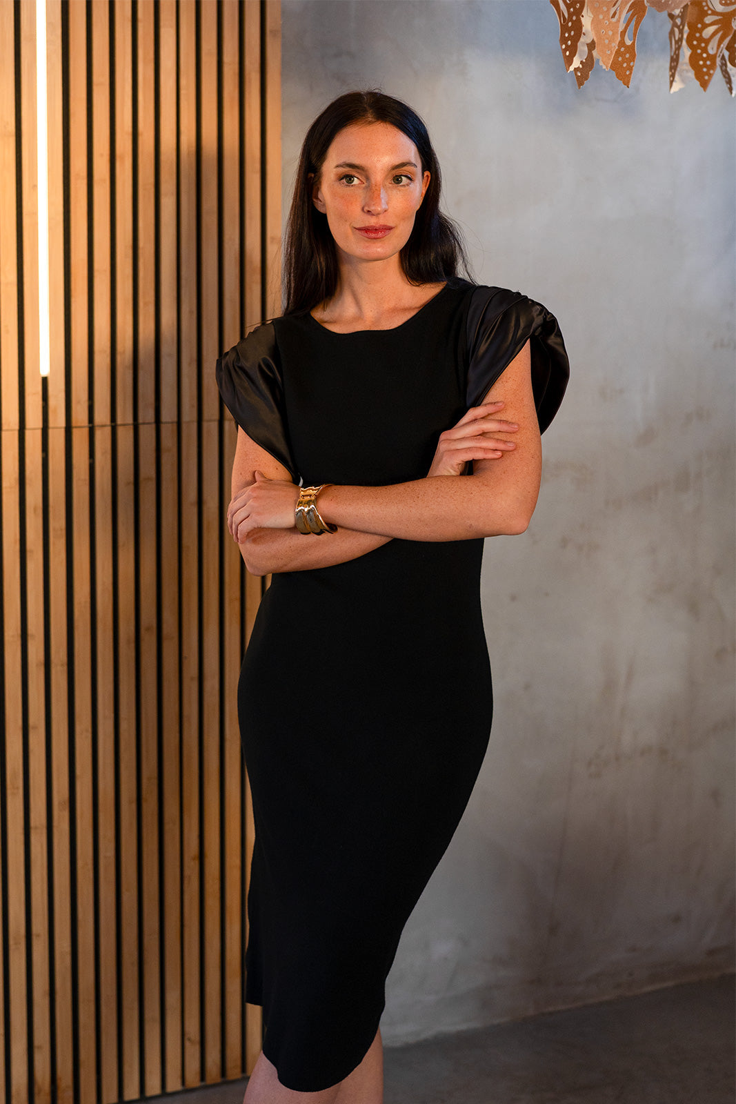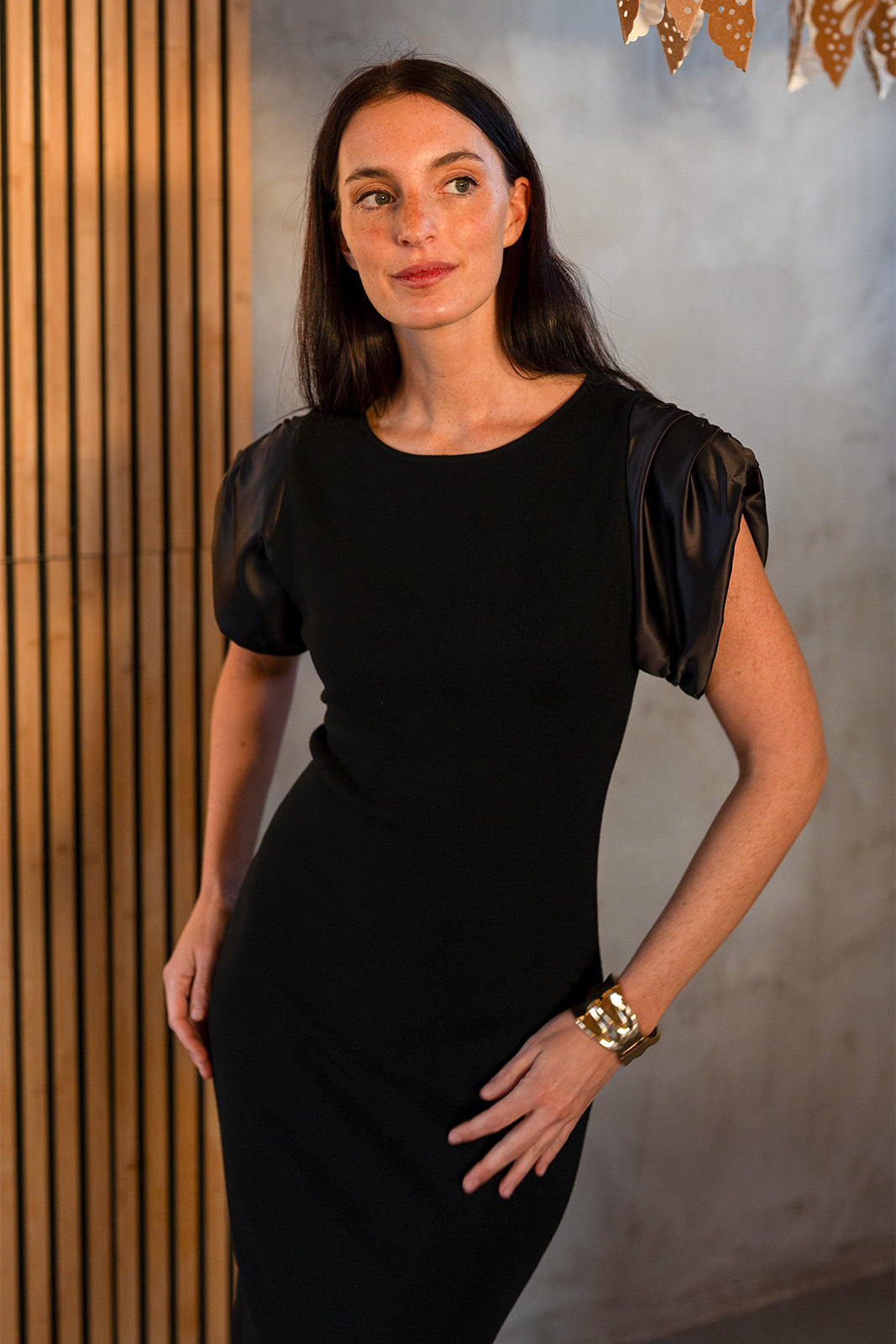 Ez az elegáns fekete ruha letisztult, mégis különleges megjelenést biztosít a különleges alkalmakra. A térdig érő fazon nőies vonalakat kölcsönöz, a fényes, selyemhatású puffos ujjak pedig modern, ünnepi karaktert adnak az összhatásnak. A puha, kényelmes anyag szépen követi a test vonalát, miközben megőrzi tartását és formáját. Minimalista szabása miatt könnyedén kombinálható hangsúlyos ékszerekkel vagy látványos kiegészítőkkel is. Ideális választás ünnepi eseményekre, elegáns vacsorákra vagy minden olyan alkalomra, ahol kifinomult, magabiztos megjelenésre vágysz.