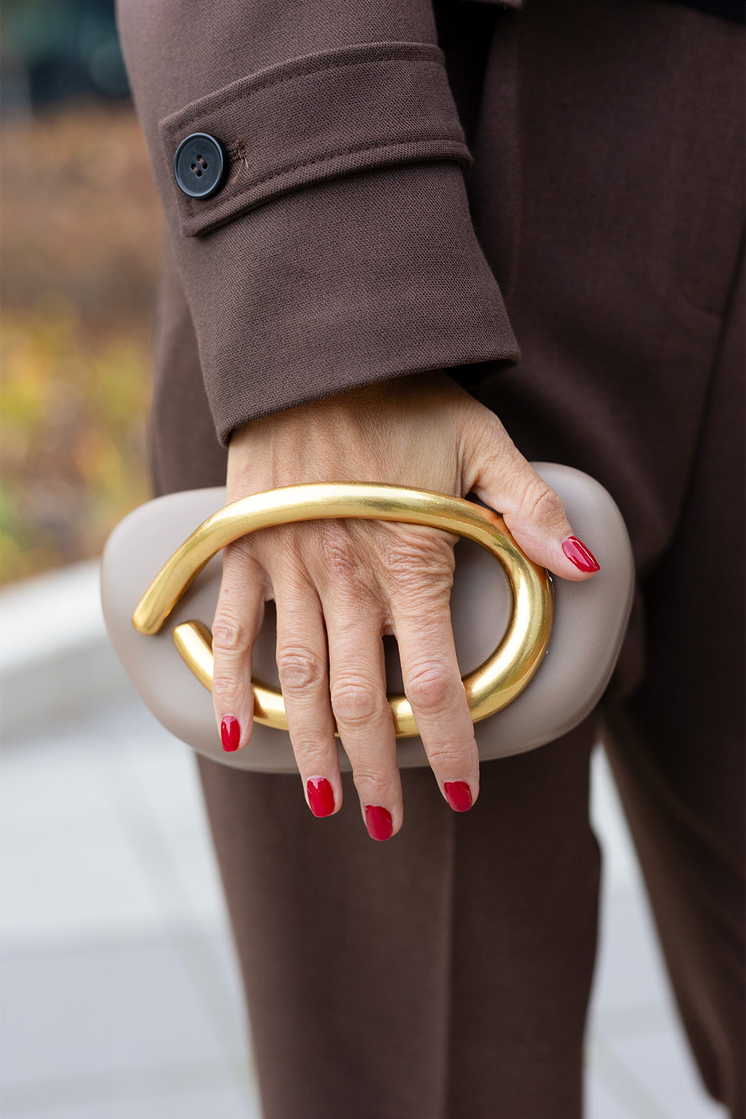 Ez a különleges, arany fogantyús mini táska a letisztult elegancia megtestesítője. A drapp vegán bőr és az arany részletek kifinomult harmóniája luxusérzetet kelt, miközben modern, szoborszerű formája igazán egyedivé teszi. Kézben tartva vagy kiegészítőként viselve egyaránt stílusos választás, legyen szó alkalmi vagy hétköznapi megjelenésről. Kompakt mérete ellenére minden fontos apróság elfér benne. Ez a táska tökéletes kiegészítő azok számára, akik szeretik az elegáns, mégis karakteres darabokat.