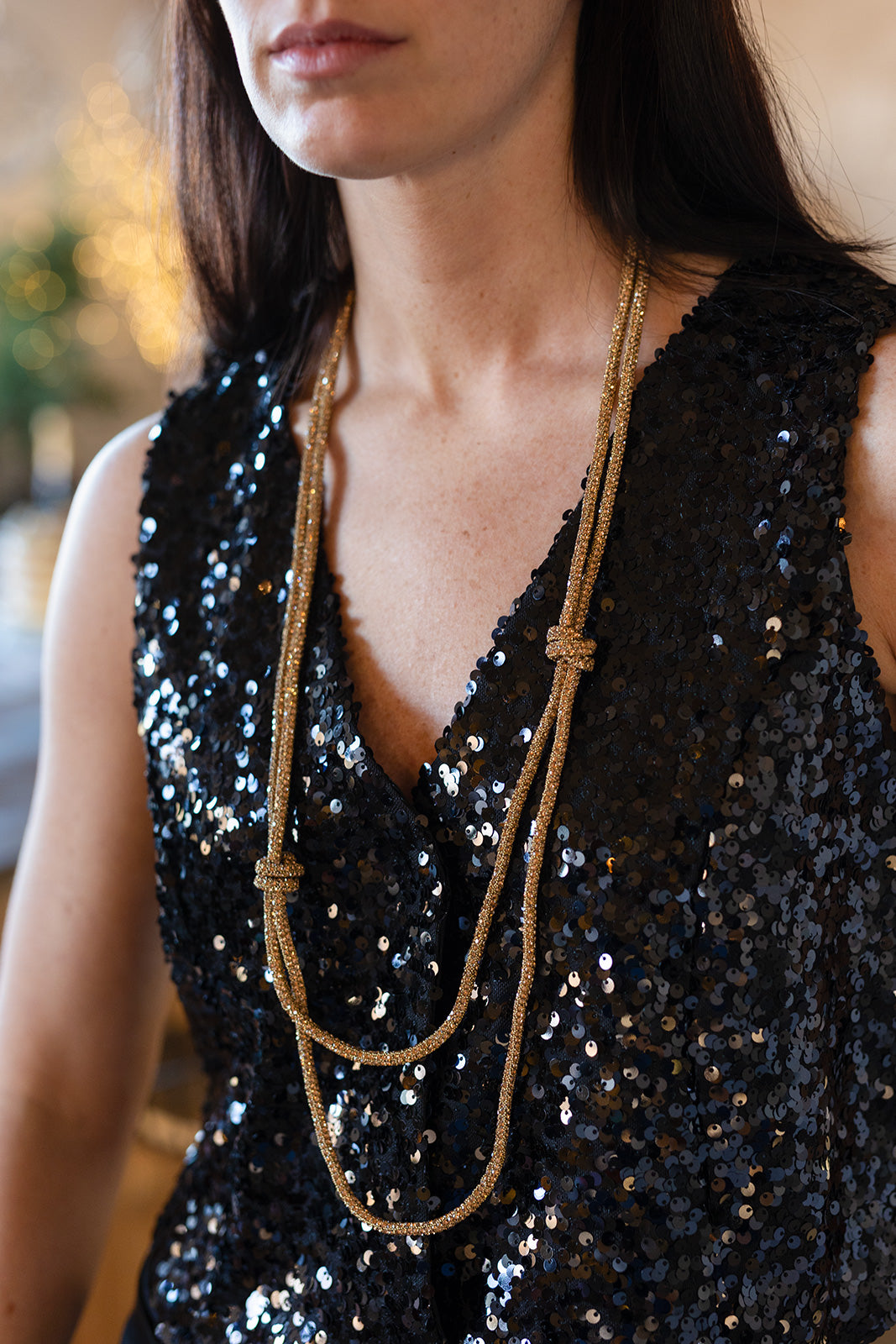 Ez a különleges, aranyló fényű hosszú nyaklánc elegáns és ünnepi megjelenést kölcsönöz bármilyen összeállításnak. Finoman csillogó, sűrűn font szálai több rétegben omlanak a dekoltázsra, látványos, mégis kifinomult hatást keltve. A dekoratív csomómegoldások modern, egyedi karaktert adnak a darabnak. Könnyedén társítható alkalmi ruhákhoz, flitteres topokhoz vagy letisztult fekete összeállításokhoz is. A nyaklánc tökéletes választás ünnepi estékhez, különleges alkalmakhoz, vagy amikor szeretnéd egyetlen kiegészítővel látványosan feldobni a megjelenésed.