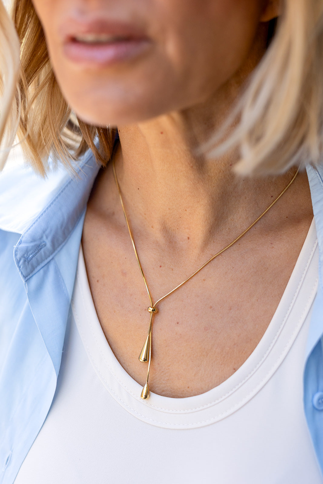Ez a finom arany színű nyaklánc letisztult vonalvezetésével és elegáns, lelógó díszítésével modern nőies karaktert ad a megjelenésnek. Állítható kialakítása lehetővé teszi, hogy különböző dekoltázsokhoz is tökéletesen illeszkedjen. Könnyed, mégis karakteres ékszer, amely önállóan viselve is kifinomult hatást kelt. Ideális választás hétköznapi eleganciához és alkalmi összeállításokhoz egyaránt.