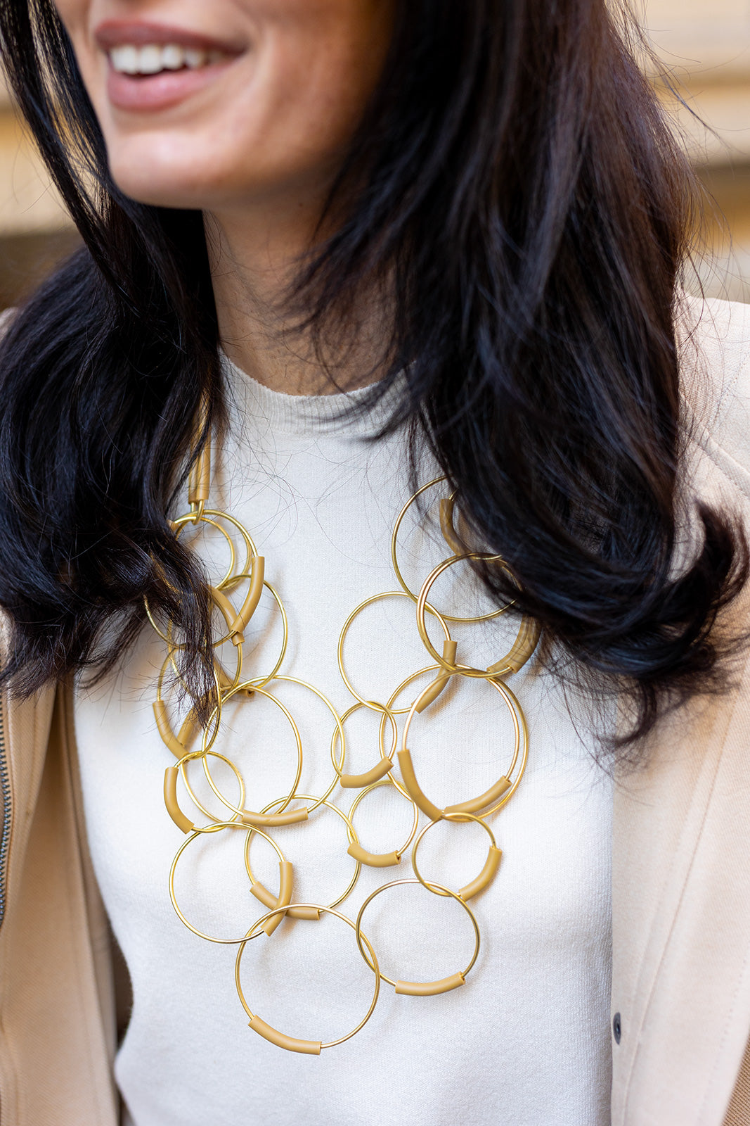 Ez a különleges női nyaklánc modern és művészi megjelenésével igazán karakteres kiegészítő. Az egymásba kapcsolódó arany tónusú körök dinamikus, mégis elegáns hatást keltenek. Látványos kialakítása azonnal magára vonzza a figyelmet, miközben kifinomult stílust kölcsönöz a megjelenésnek. Tökéletes választás egyszerű felsők vagy elegáns ruhák feldobására. Könnyű és kényelmes viselet, így egész nap stílusosan hordható. Egy modern statement nyaklánc, amely a női outfitek meghatározó kiegészítője lehet.