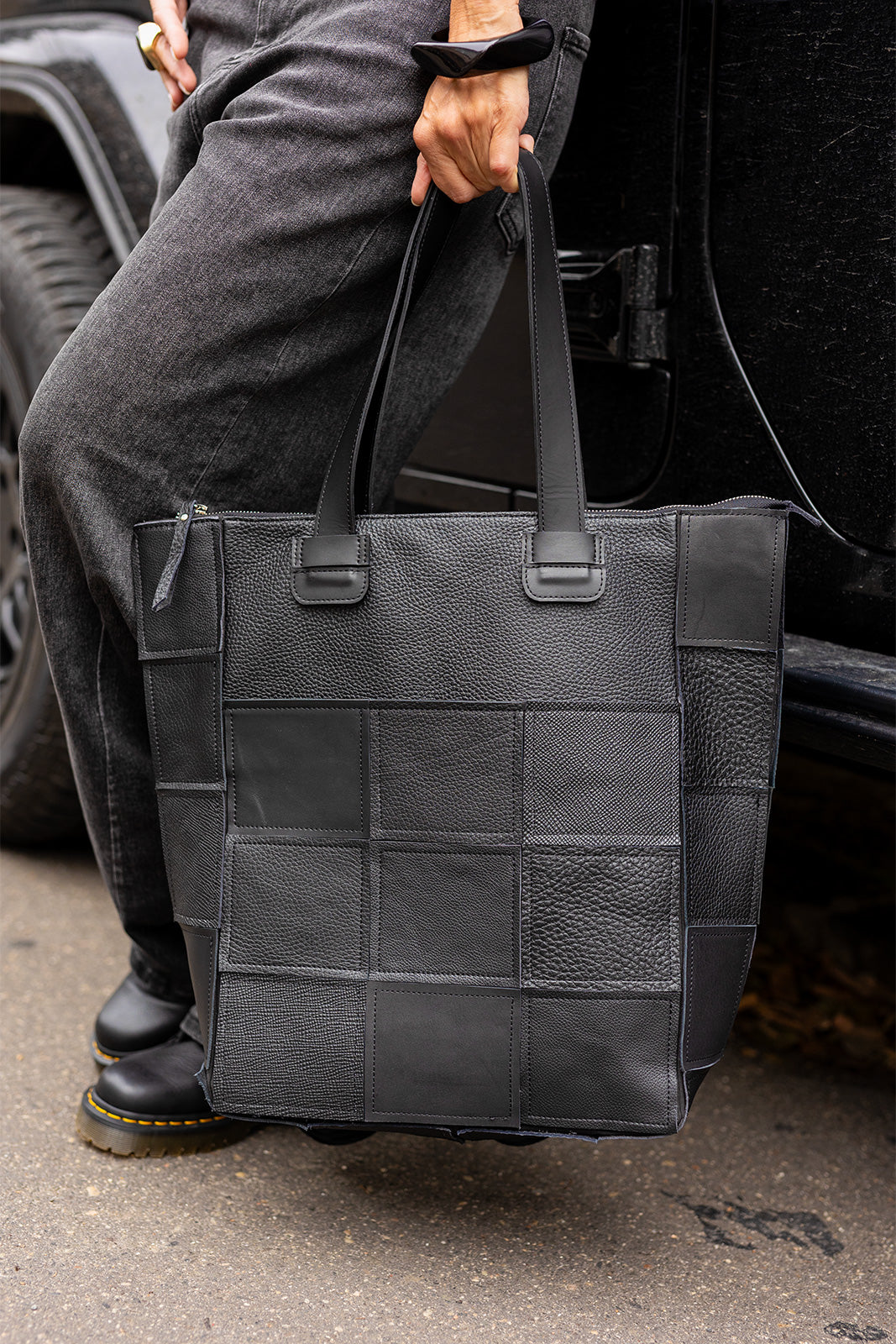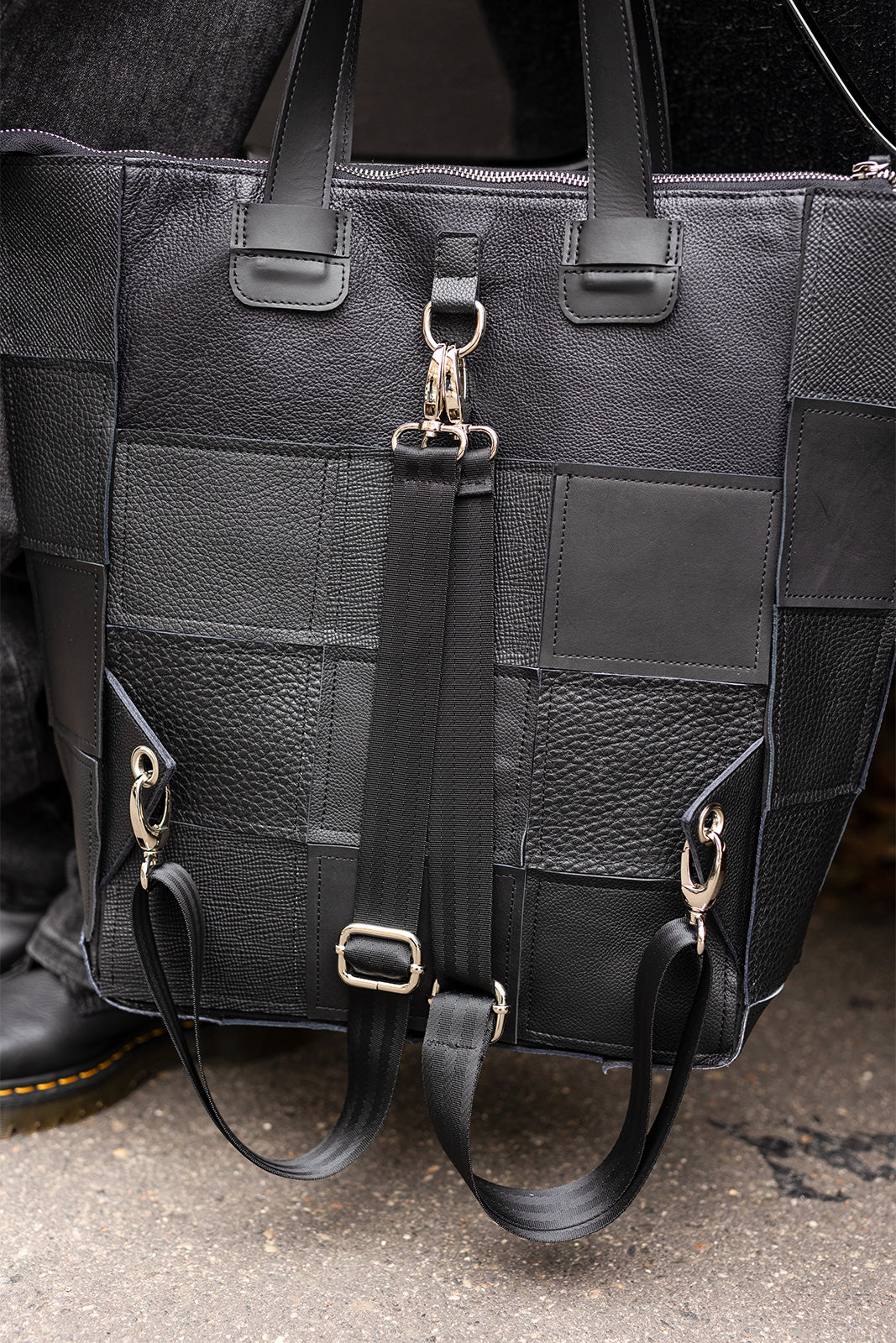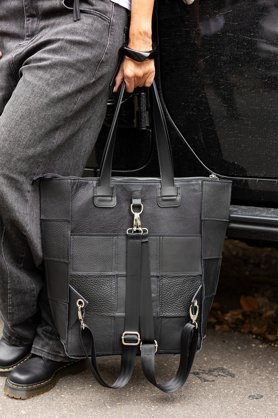 Ez a fekete, patchwork mintás bőr táska karakteres és egyedi megjelenésével azonnal magára vonja a figyelmet. A különböző textúrájú bőrdarabokból készült kialakítás prémium hatást kelt, miközben a praktikus megoldásoknak köszönhetően rendkívül sokoldalú. A táska kézben, vállon és akár hátizsákként is hordható, így könnyedén igazodik a mindennapi élet dinamikájához. Cipzáras záródása biztonságos, tágas belső tere pedig minden fontos holminak helyet biztosít. Modern, városi stílusú kiegészítő, amely ötvözi az eleganciát és a funkcionalitást.