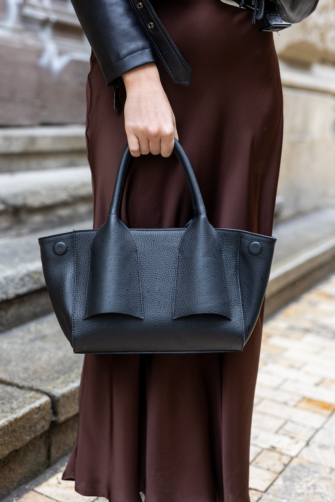 Ez a strukturált fekete bőrtáska letisztult formájával és finoman ívelt részleteivel elegáns, mégis modern megjelenést ad minden szettnek. Kompakt mérete ideális a mindennapi alapdarabok praktikus és stílusos hordozásához.