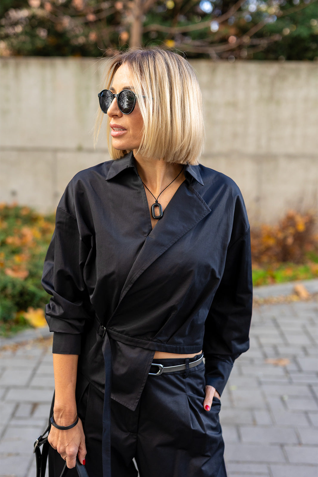 Ez a modern, fekete wrap-fazonnal készült felső elegáns és letisztult megjelenést biztosít. Keresztpántos kialakítása optikailag karcsúsít, miközben a deréknál állítható megkötő gondoskodik a tökéletes illeszkedésről. Könnyed, mégis tartásos anyaga miatt kényelmes viselet akár egész napra. A galléros rész és a hosszított ujj stílusos, minimalista hatást kelt, ezért ideális irodai vagy alkalmi szettekhez is. Magas derekú nadrággal és klasszikus kiegészítőkkel különösen ízléses összeállítást alkot. Ha egy modern, karakteres felsőre vágysz, amely egyszerre nőies és visszafogottan elegáns, ez tökéletes választás.