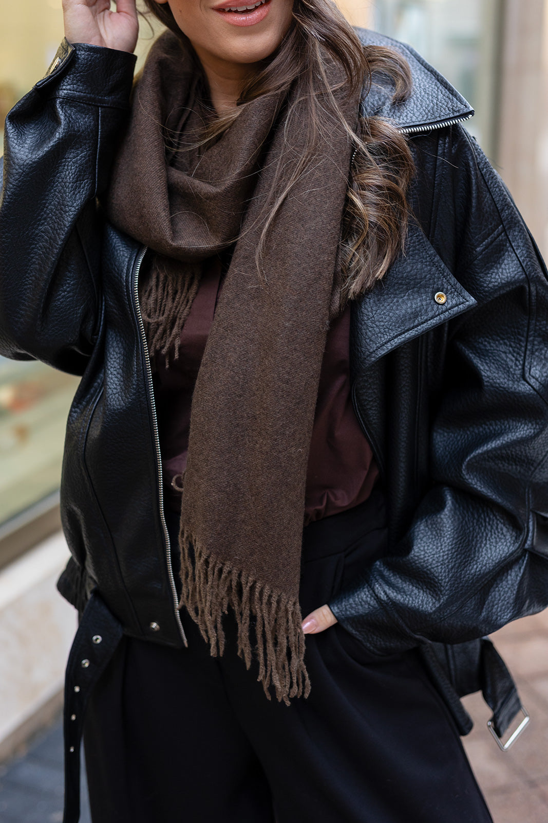 Ez a fekete, prémium vegán bőr dzseki modern, mégis időtlen darab, amely a letisztult elegancia és a vagány stílus tökéletes harmóniáját hozza. Különleges, enyhén strukturált felülete egyedi megjelenést biztosít, miközben puha tapintása kényelmes viseletet garantál. Laza, mégis nőies szabása miatt egyszerre viselhető hétköznapokon és stílusos alkalmakra is. A derékrészen található öv és a fémes részletek karakteres, divatos hatást kölcsönöznek. Egy ikonikus darab, amely minden szezonban megállja a helyét.