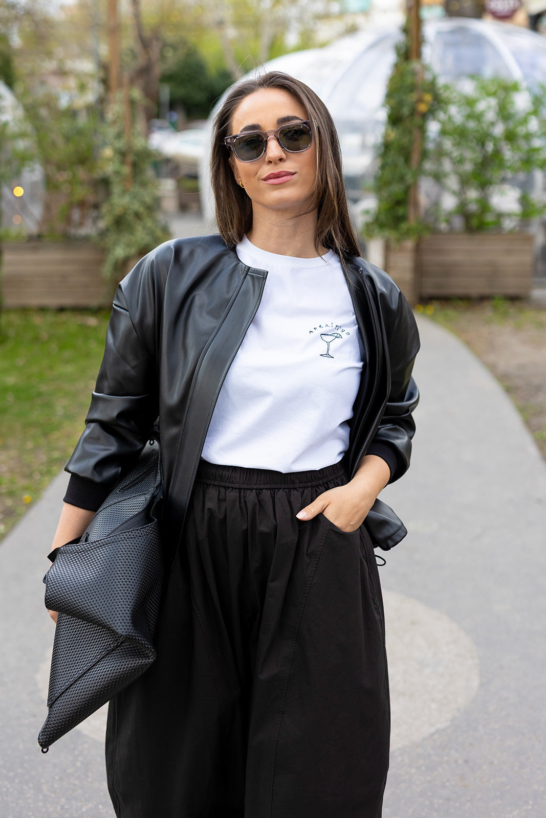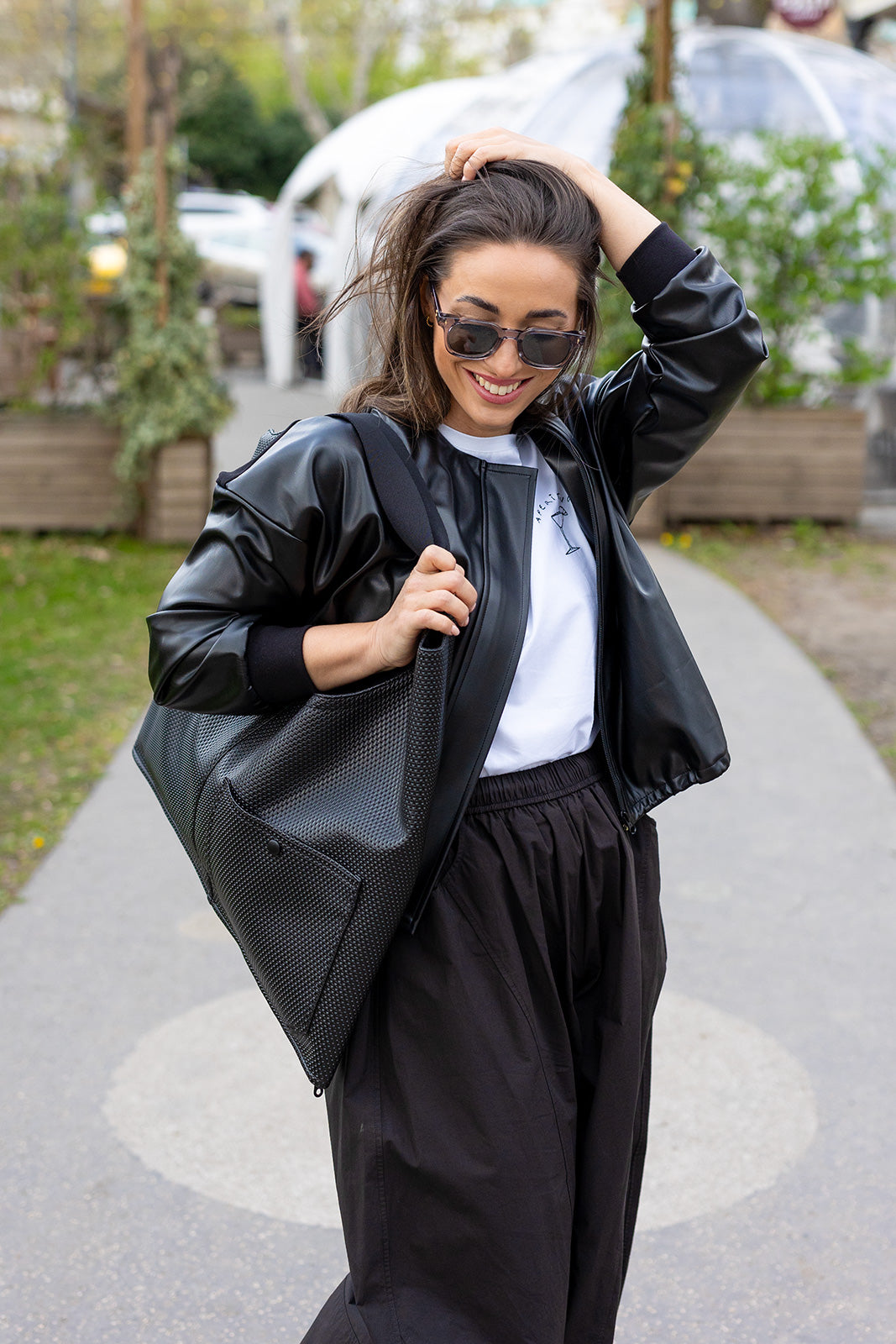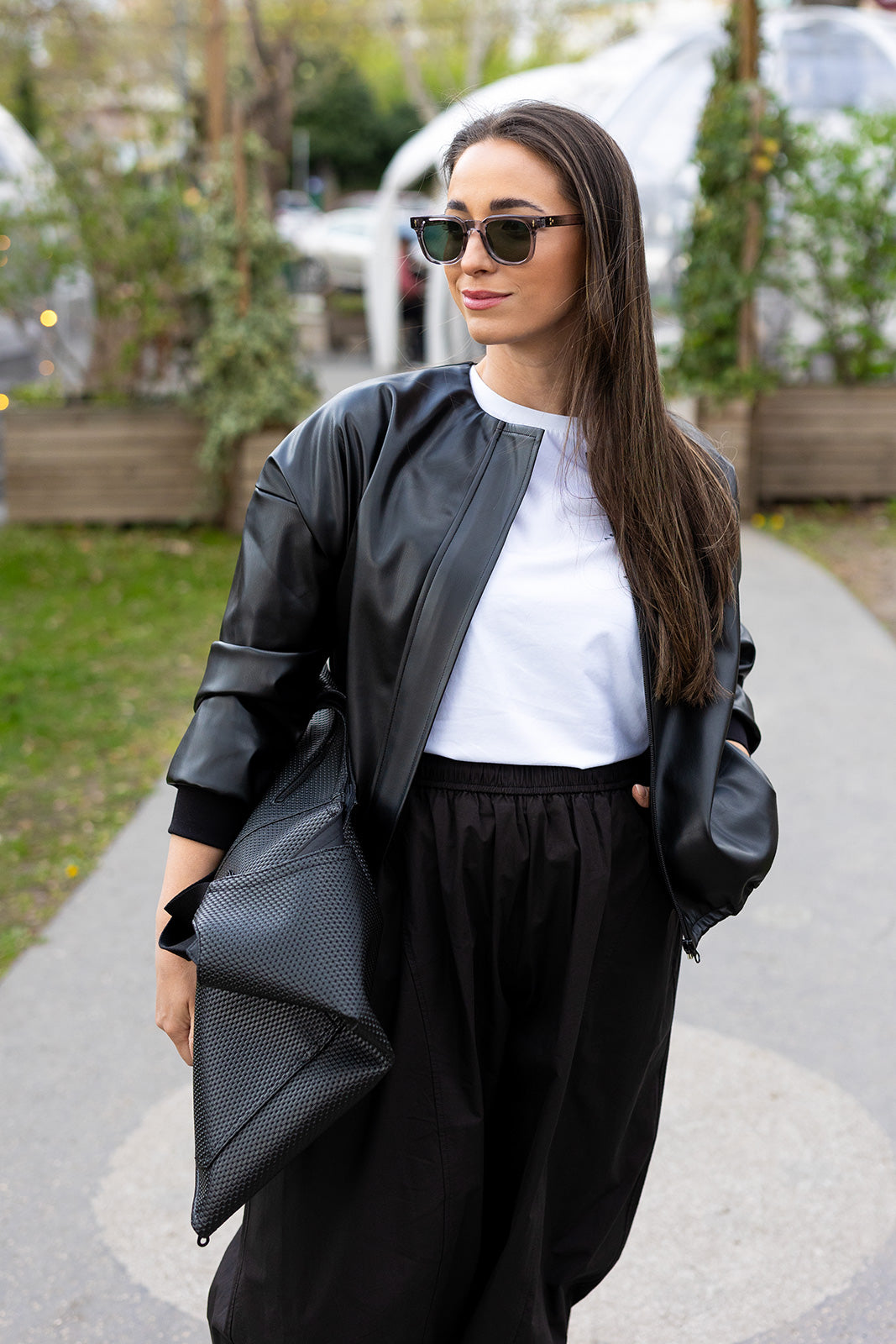 Ez a letisztult fekete dzseki a modern női gardrób egyik kulcsdarabja. Könnyed szabásával és finoman strukturált felületével egyszerre sportosan elegáns és városi karakterű.