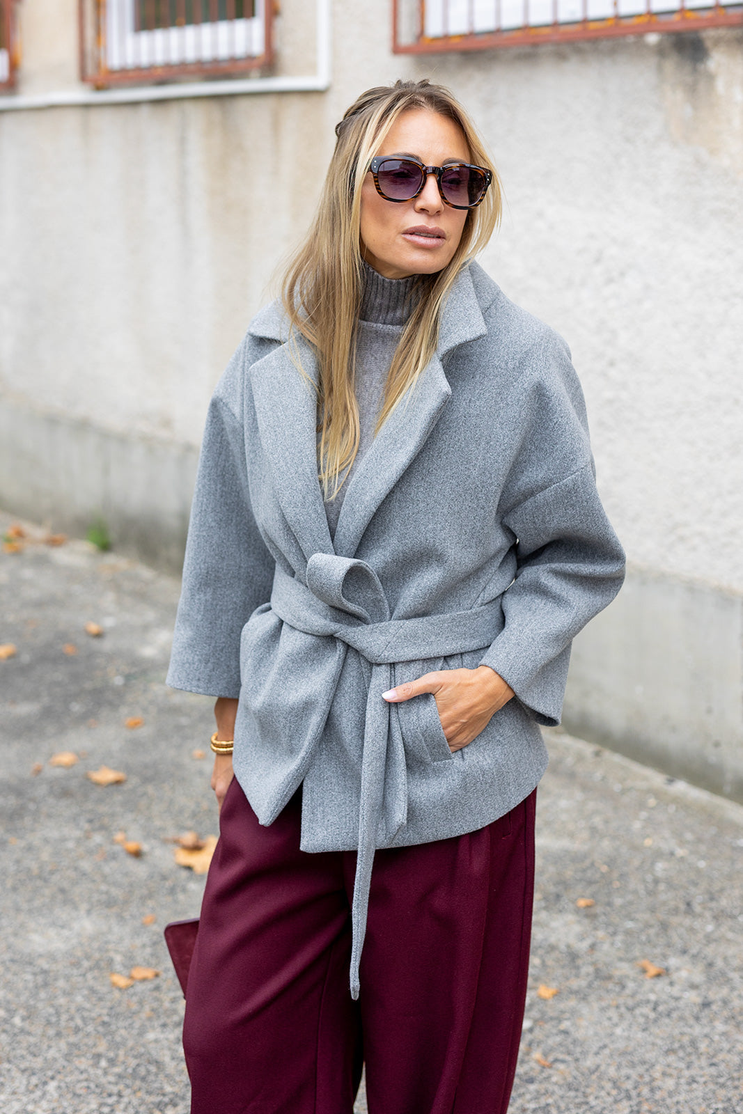 Ez a modern, övvel megköthető szürke kabát tökéletes választás a stílus és a kényelem kedvelőinek. Puha, meleg anyagból készült, amely ideális a hűvösebb napokra. A letisztult szabásvonal és a visszafogott szín könnyedén kombinálható bármilyen outfithez. Praktikus, mégis elegáns darab, amely kiemeli viselője nőies vonalait. Akár hétköznapi, akár alkalmi összeállításban is megállja a helyét.