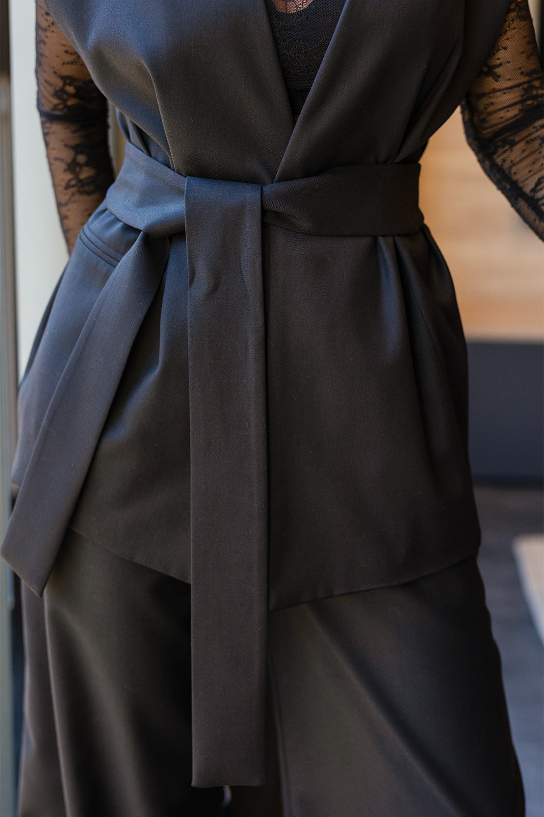 Ez a letisztult, hosszabb szabású szövet mellény ideális választás az őszi-tavaszi szezonra, ha rétegezhető, elegáns megjelenésre vágysz. Saját anyagából készült övével hangsúlyozhatod a derekat, míg a méret nélküli kialakítás kényelmes, univerzális viseletet biztosít. Tökéletes blúz, garbó vagy akár kötött pulóver fölé is – stílusos és időtálló darab.
