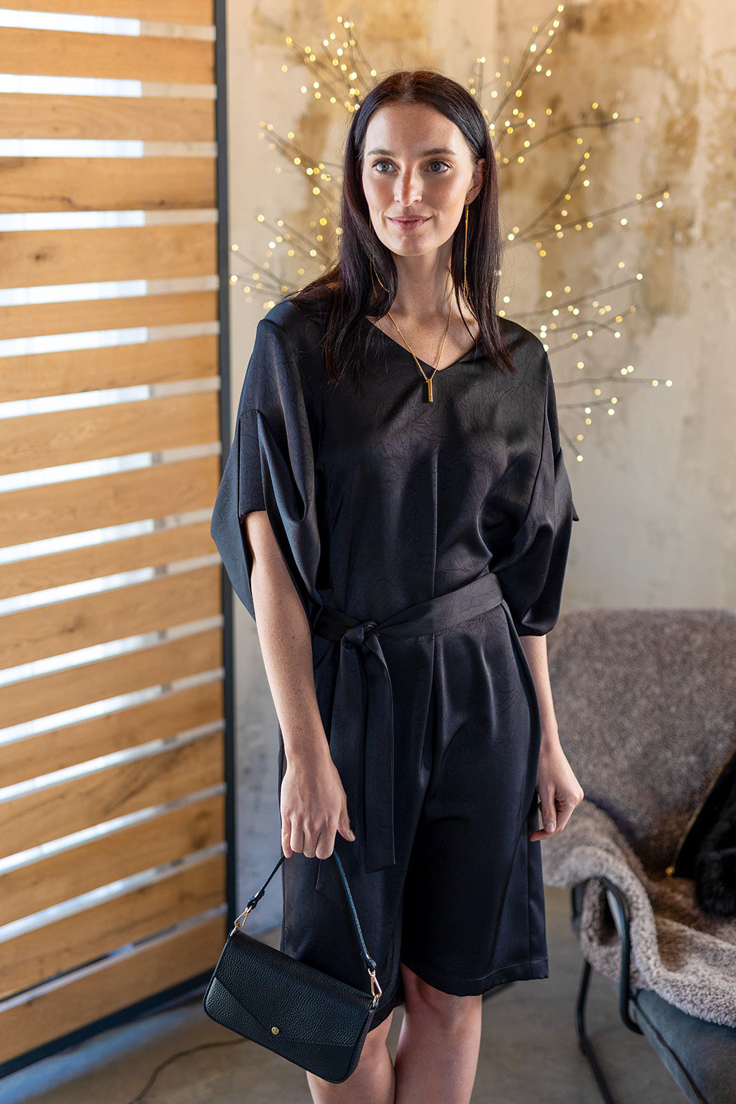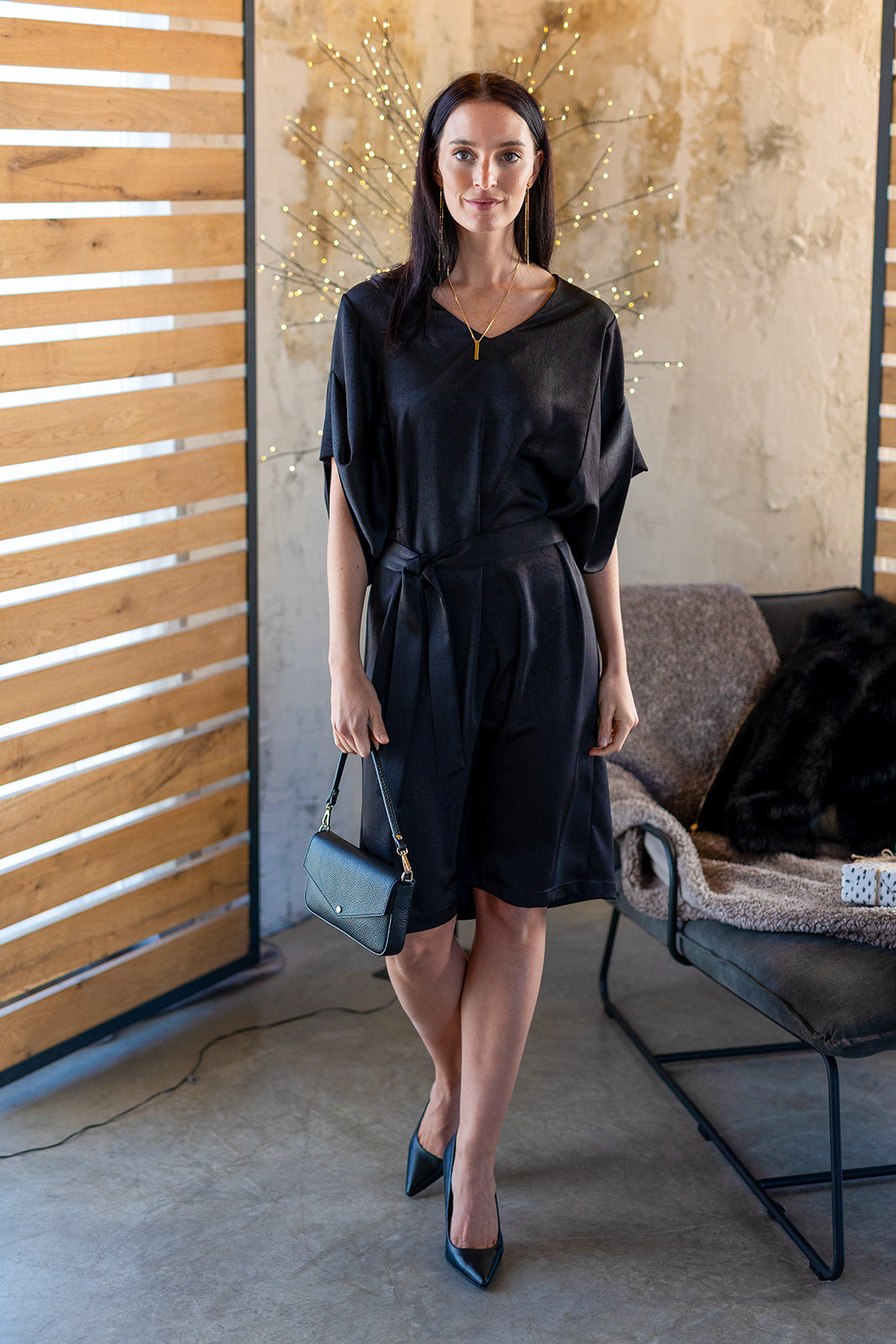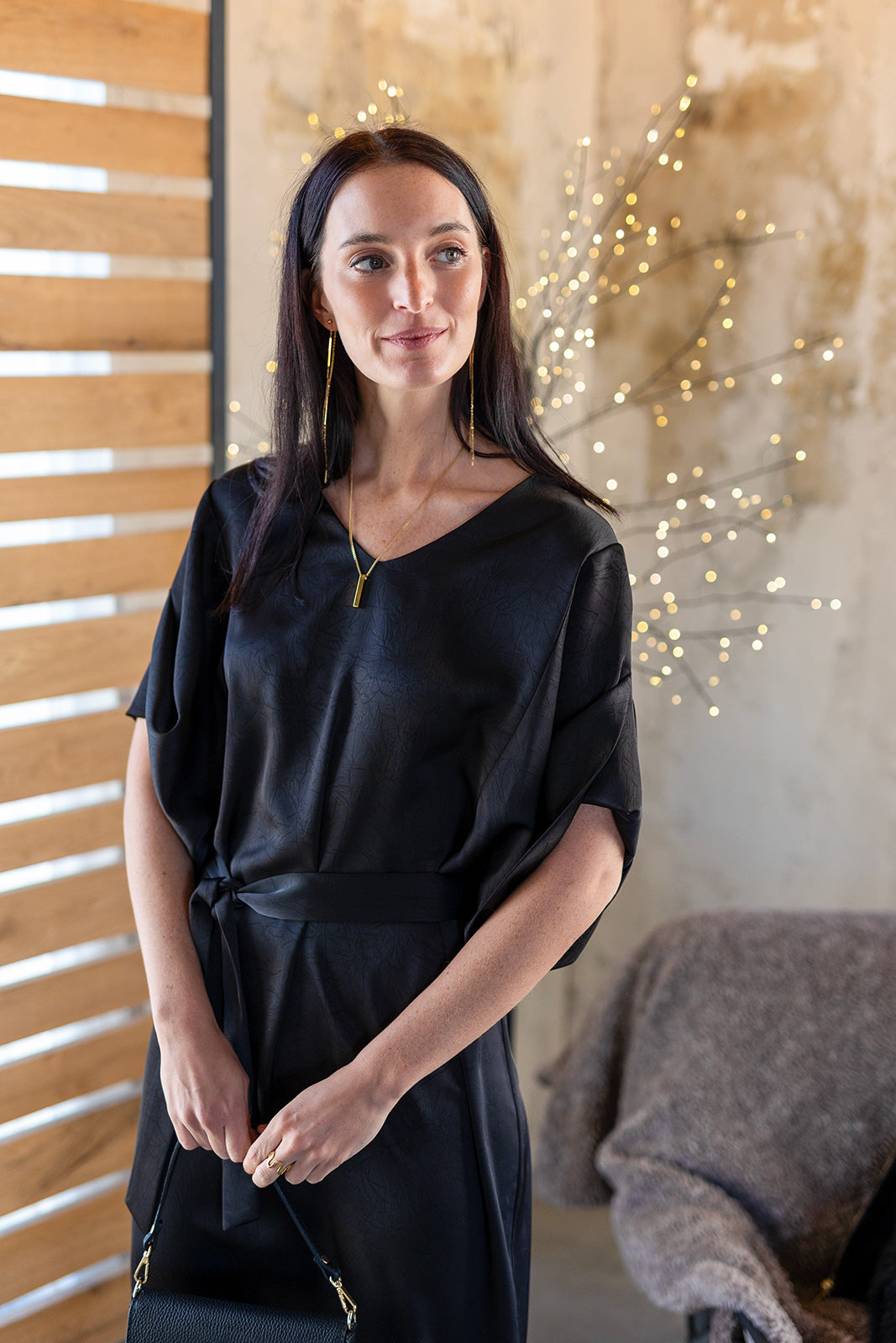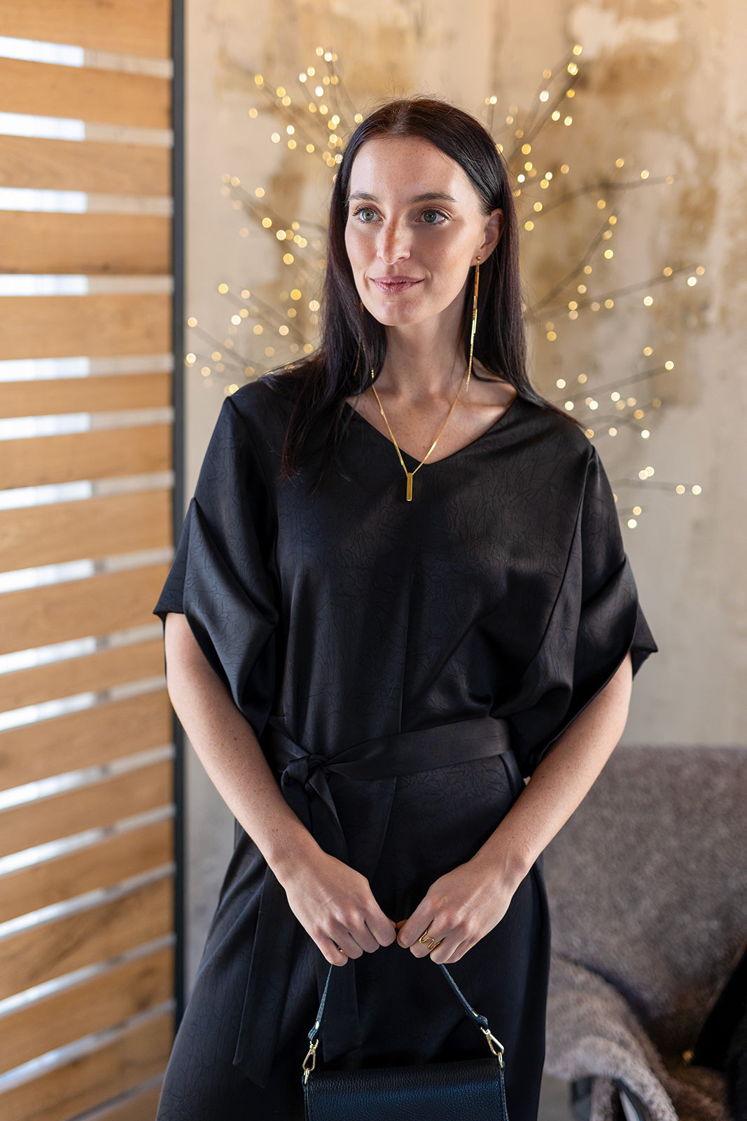 Elegáns, fekete midiruha, amely letisztult vonalaival és különleges szabásával igazán modern megjelenést biztosít. Könnyed, selymes tapintású anyaga szépen követi a test vonalát, miközben megőrzi kényelmes, légies esését. A deréknál megkötős megoldás emeli ki a nőies sziluettet, és finom hangsúlyt ad az alaknak. Rövid, bő ujjai és V-kivágása elegáns, mégis lezser hatást keltenek. Tökéletes választás ünnepi alkalmakra, esti programokra vagy bármilyen eseményre, ahol stílusos, visszafogottan luxus megjelenésre vágysz. Kiegészítőkkel könnyen variálható, így minden alkalommal más arcát mutatja.
