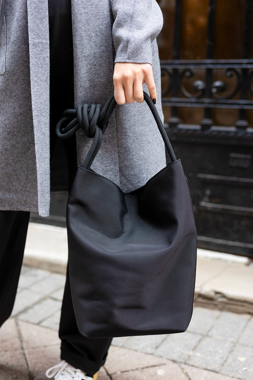 Erős, csomózott pántja nemcsak különleges dizájnelem, hanem kényelmes fogást is ad. Tágas belső tere ideális a napi essentials – pénztárca, telefon, jegyzetfüzet – rendezett tárolására.