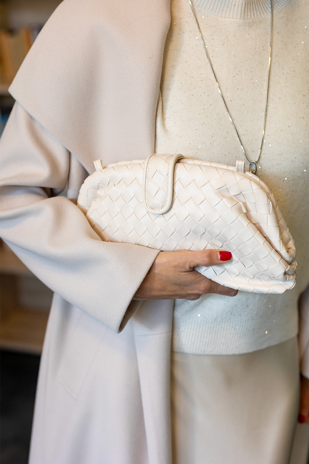 Ez a fonott vegán bőr clutch táska a stílusos minimalizmus megtestesítője. Prémium minőségű, puhán strukturált valódi bőrből készült, amely időtálló eleganciát és finom fényt biztosít. A táska kézzel szőtt mintázata különleges textúrát ad, míg a kompakt méret tökéletes választás esti programokhoz vagy elegáns nappali megjelenéshez. Egyszerre modern és klasszikus darab, amely bármilyen szettet feldob.