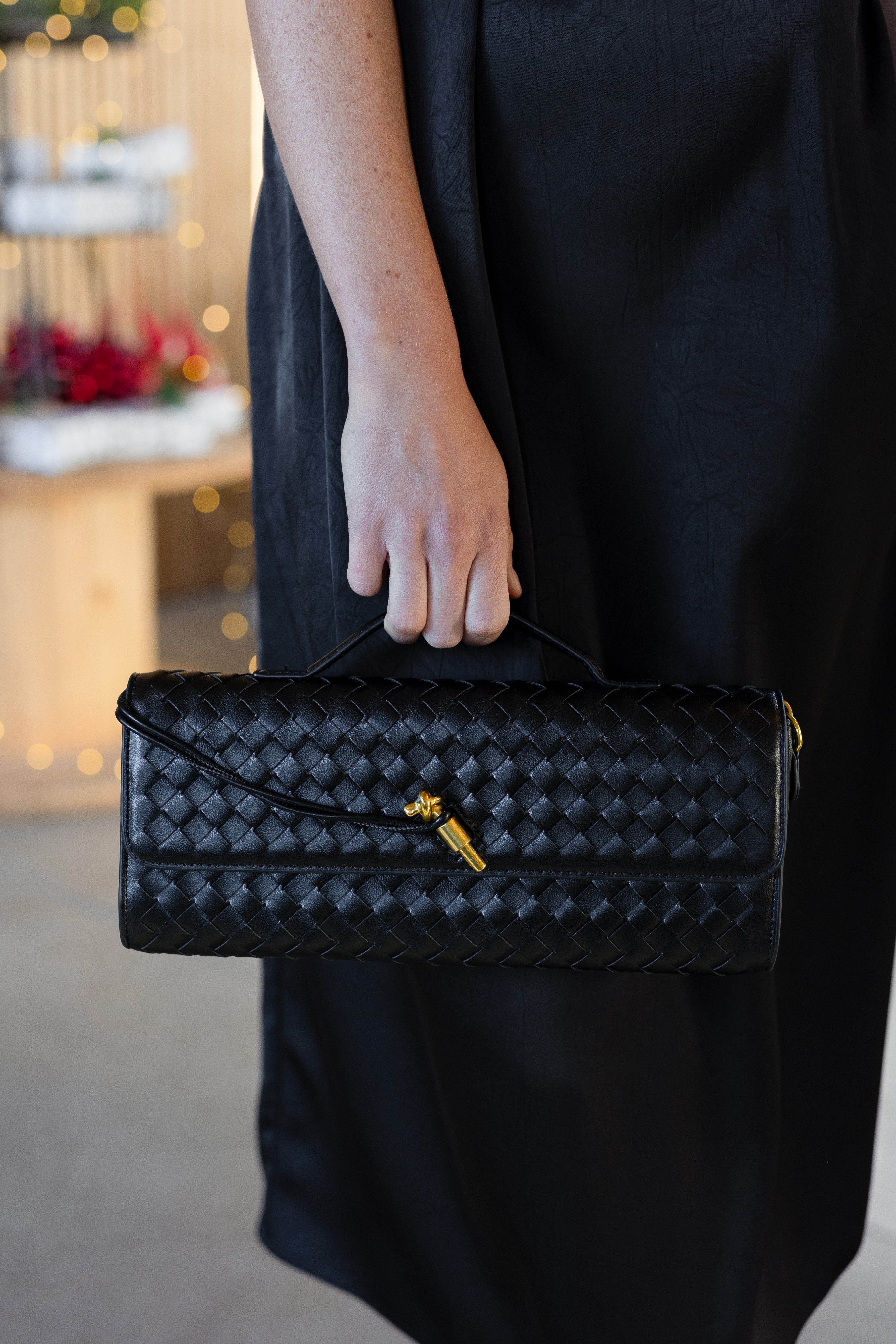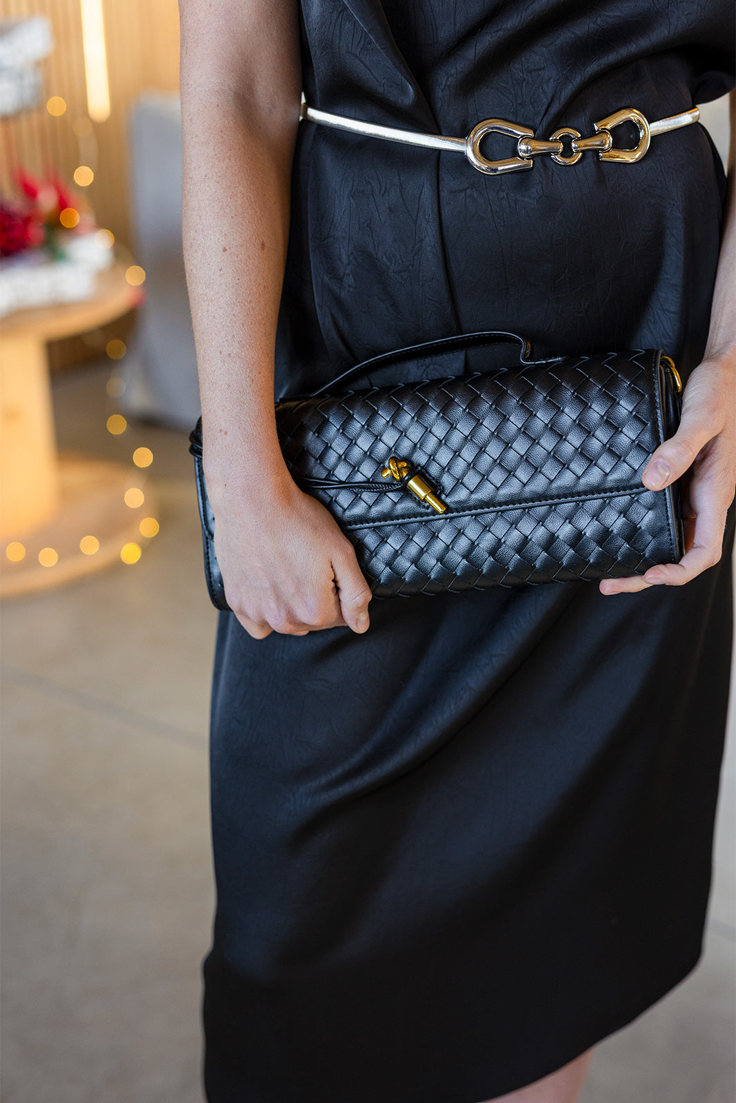 Ez a fekete, fonott mintás váll- és kézitáska a nőies elegancia és a modern stílus tökéletes ötvözete. Finom részletei és arany színű csatja kifinomult megjelenést kölcsönöznek. Kompakt mérete ellenére elég helyet biztosít a legfontosabb mindennapi kiegészítőknek. Állítható pántjának köszönhetően kényelmesen hordható kézben vagy vállon is. Letisztult, időtlen darab, amely bármely szettet elegánssá varázsol.